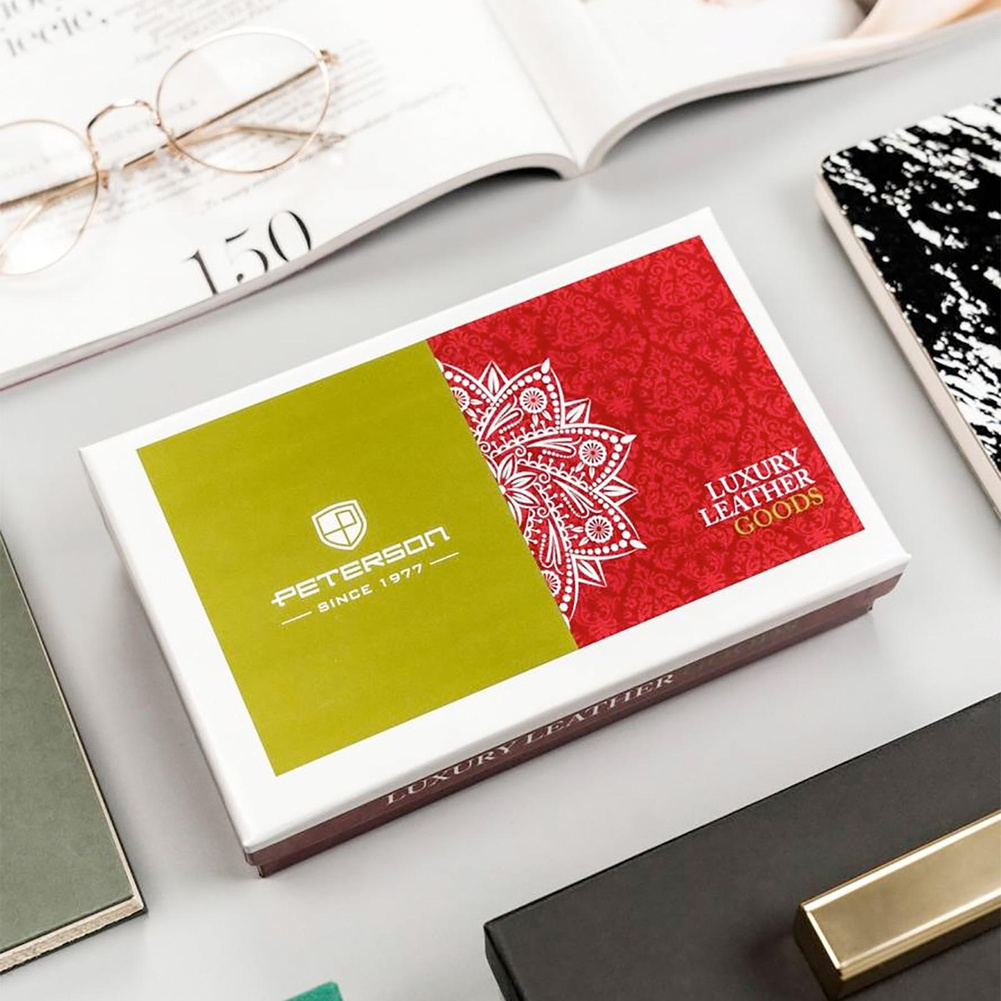 - 2 schowki na duże dokumenty. Jeden ze schowków mieści się po zewnętrznej stronie portfela, z tyłu;