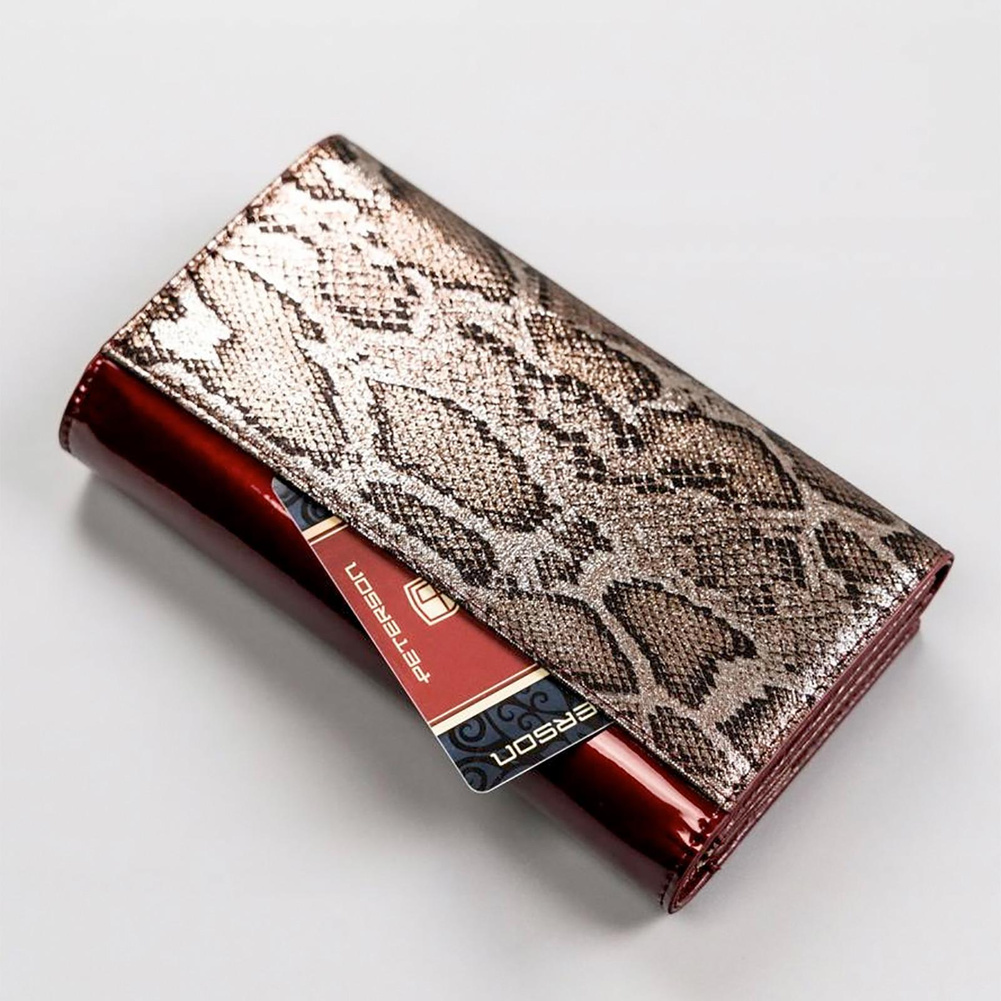 - Rewelacyjny design | Portfel o klasycznym fasonie i najmodniejszym wzorze skóry węża w złotym kolorze. Przez środek biegnie wstawka z lakierowanej skóry, która świetnie kontrastuje z resztą portfela. Model w orientacji poziomej zapinany klapką na zatrzask