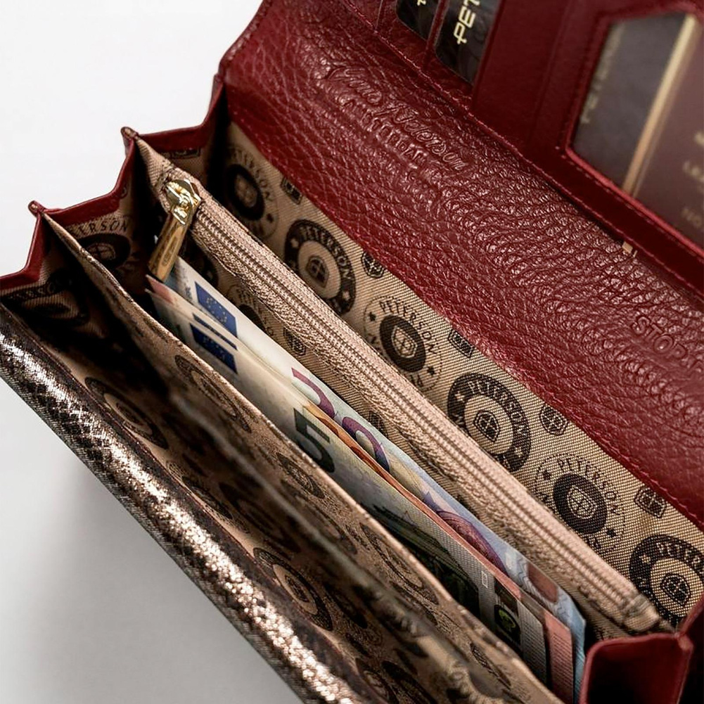 Portfel zapinany jest na wyjątkowo mocny zatrzask ukryty pod klapą. Wewnętrzna część jest niezwykle pojemna, bo kryje w sobie mnóstwo kieszonek i przegródek.