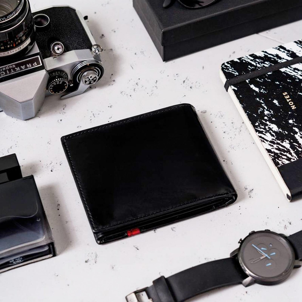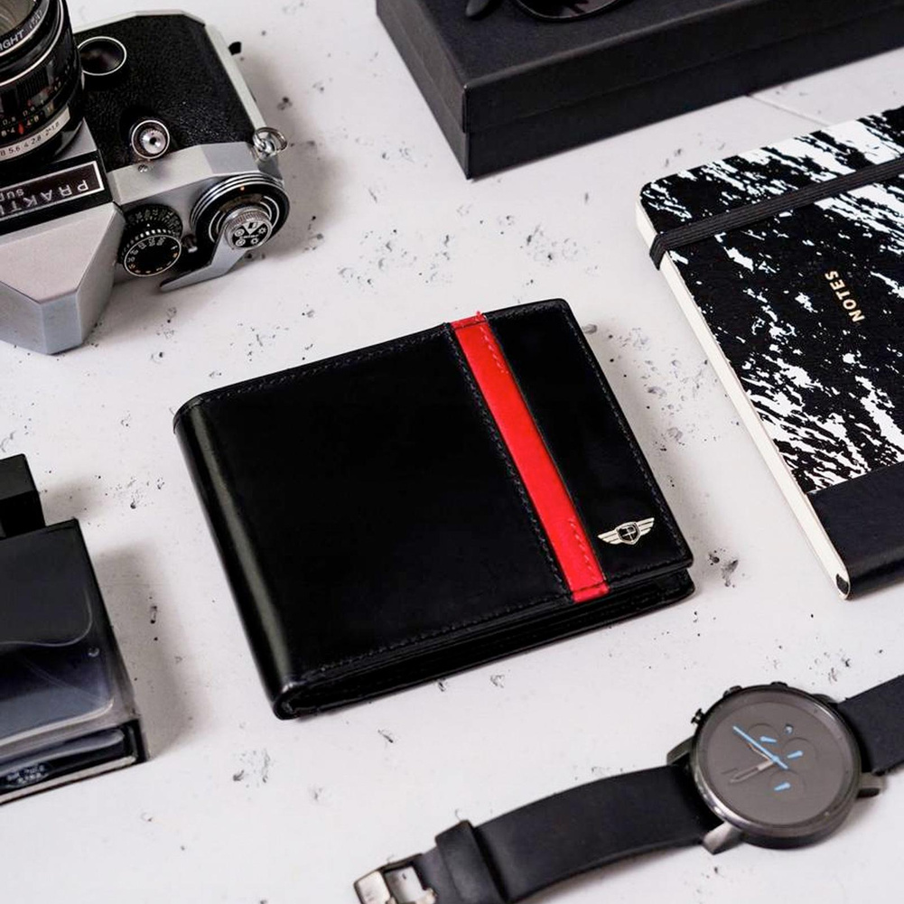 Elegancki fason, który nigdy nie wyjdzie z mody | Czarny kolor to klasyka, a portfel w tym kolorze daje poczucie komfortu i świadomość, że możesz poczuć się modnie. Front portfela zdobi elegancki czerwony pasek