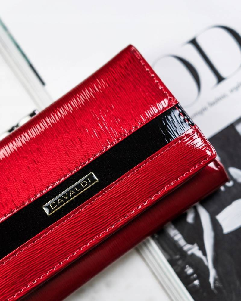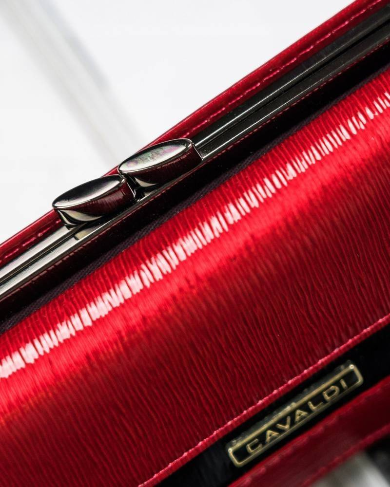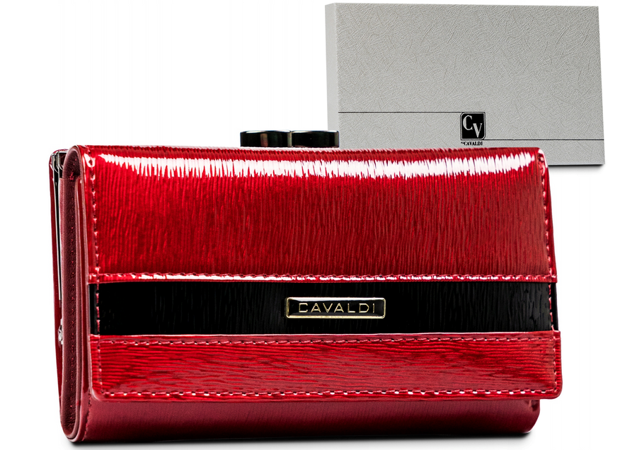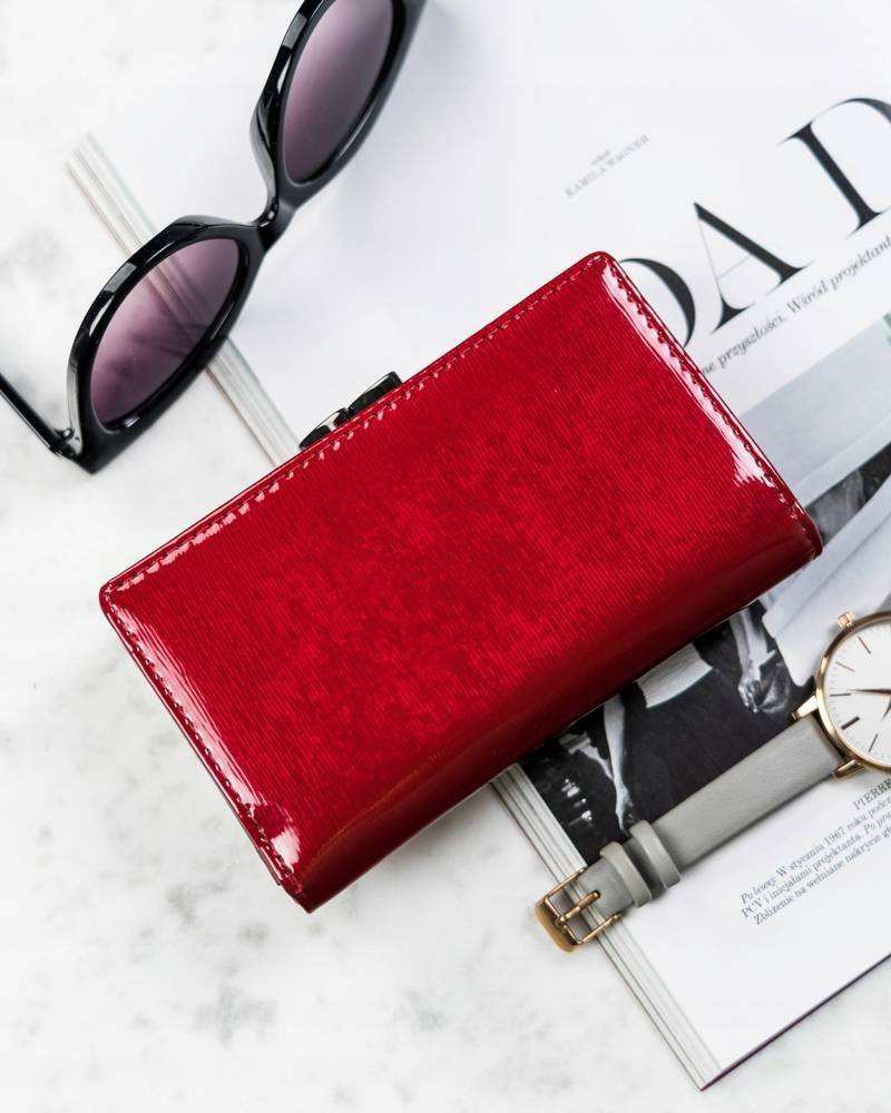 - Klasyczny fason z pięknym tłoczeniem | Skóra portfela po stronie zewnętrznej jest lakierowana. Zamykany klapką na zatrzask. Front ozdobiony tłoczonym logo marki;