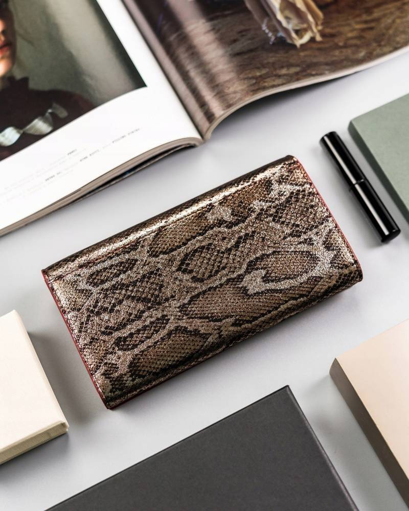 - Rewelacyjny design | Portfel o klasycznym fasonie i najmodniejszym wzorze skóry węża w złotym kolorze. Przez środek biegnie wstawka z lakierowanej skóry, która świetnie kontrastuje z resztą portfela. Model w orientacji poziomej zapinany klapką na zatrzask
