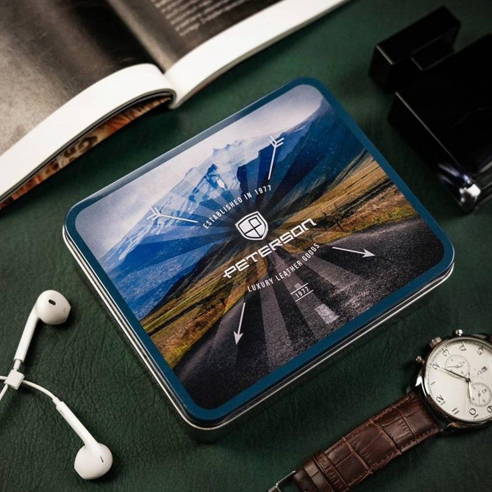 Każdy portfel zapakowany jest w elegancką firmową puszkę.
