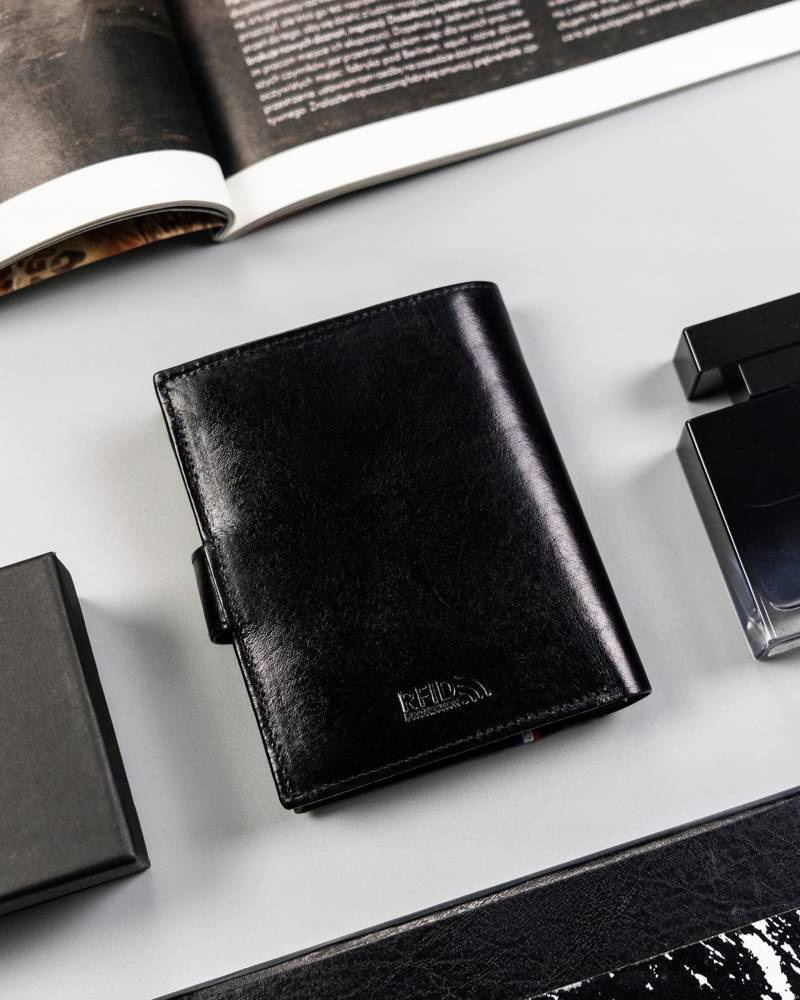 - Zapinany na zatrzask | Duży portfel o klasycznej stylistyce. Model w orientacji pionowej z zapięciem zewnętrznym na zatrzask;