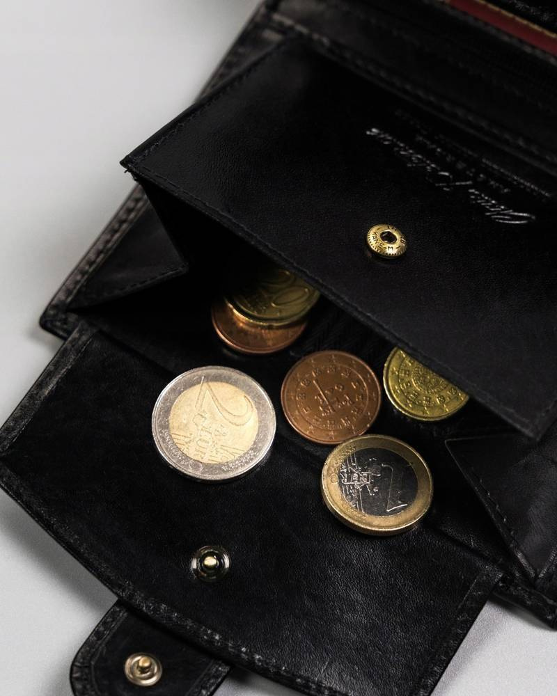 - Ergonomiczny design | Odszyty bardzo trwale z doskonałej jakości gładkiej skóry naturalnej w czarnym kolorze, dodatkowo na froncie portfela wyszyto trójkolorowy paseczek;