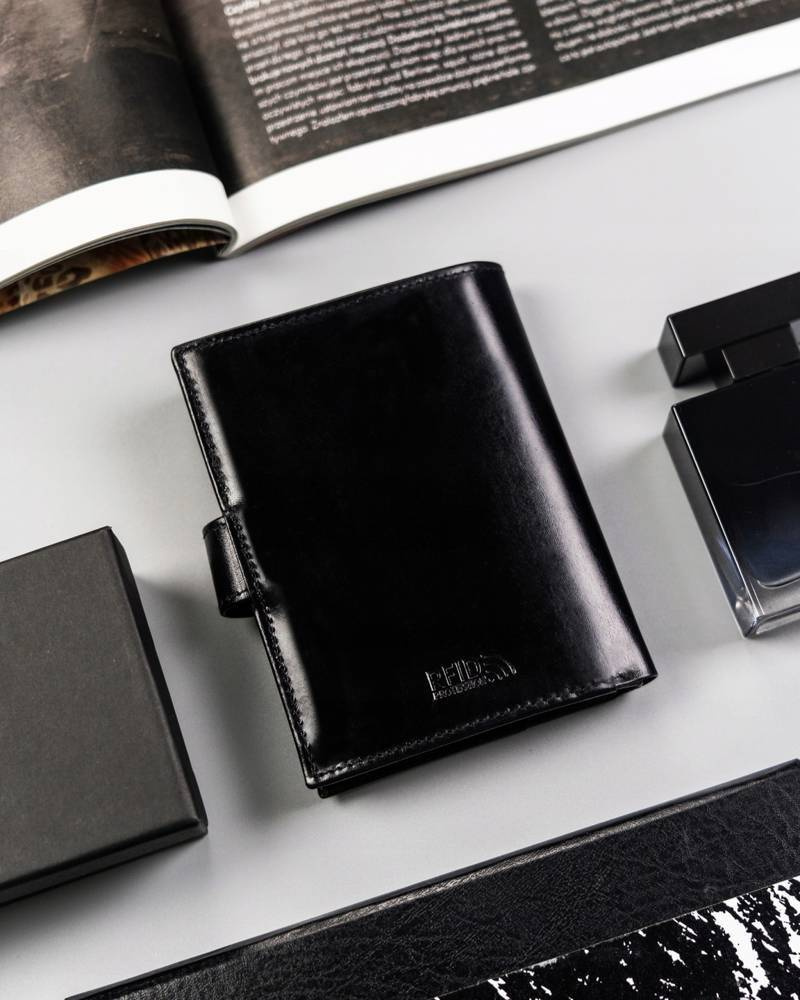 - Duży portfel o klasycznej stylistyce. Model w orientacji pionowej zapinany na zatrzask;