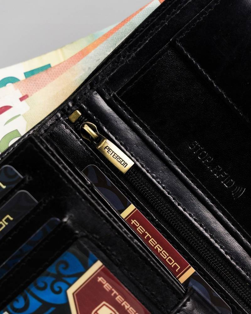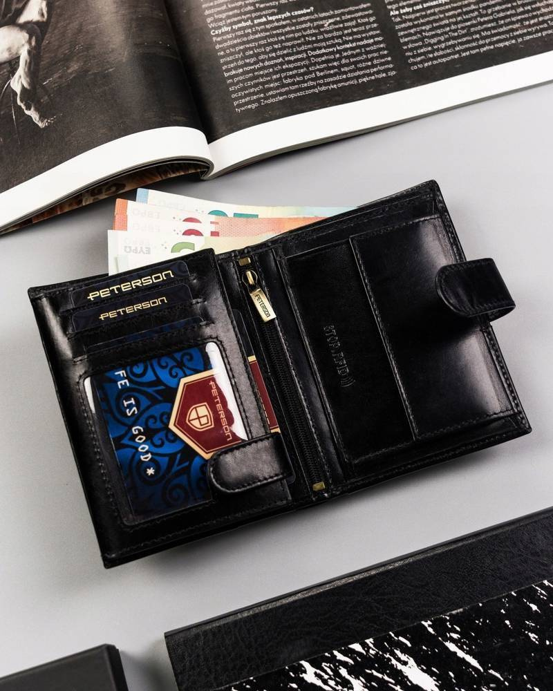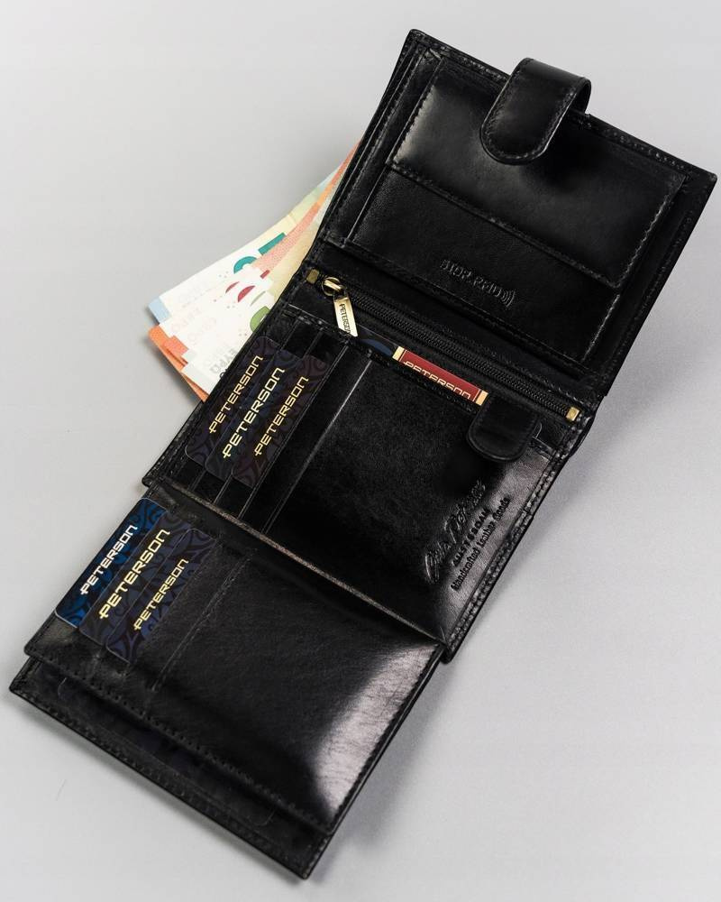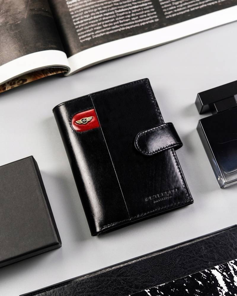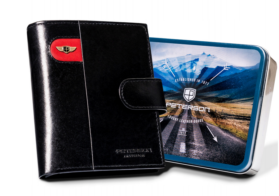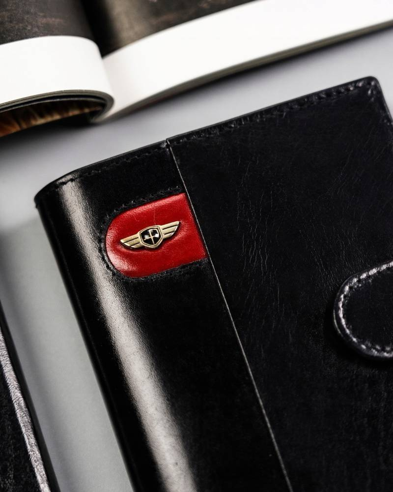 - Ergonomiczny design | Odszyty bardzo trwale z doskonałej jakości gładkiej skóry naturalnej w czarnym kolorze, dodatkowo na froncie portfela wyszyto trójkolorowy paseczek;