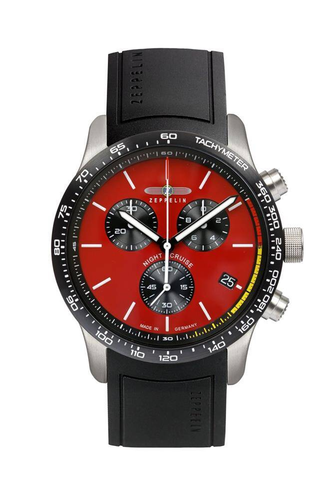 ETA G10.212, tarcza czerwona, średnica 42 mm, szkło mineralne K1, wskazówki i indeksy z Super-LumiNova, koperta stalowa, dekiel stalowy, chronograf, WR 10 ATM, pasek kauczukowy