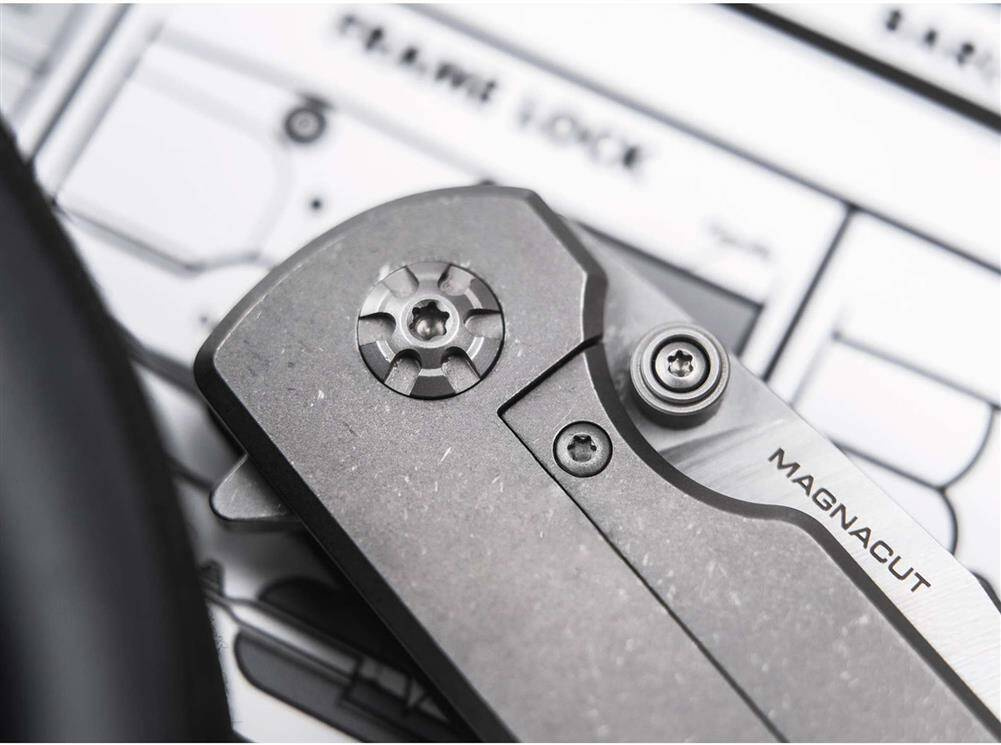 Łożysko kulkowe jest otwierane na przemian za pomocą kołka kciuka i blokowane przez solidną tytanową ramę z wykończeniem stonewash.