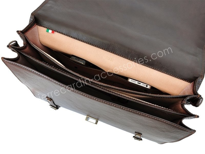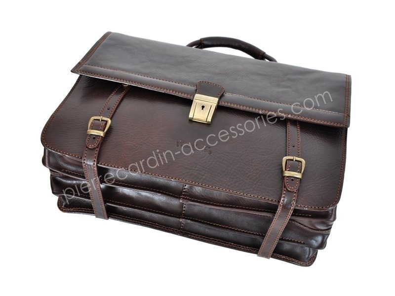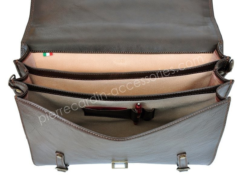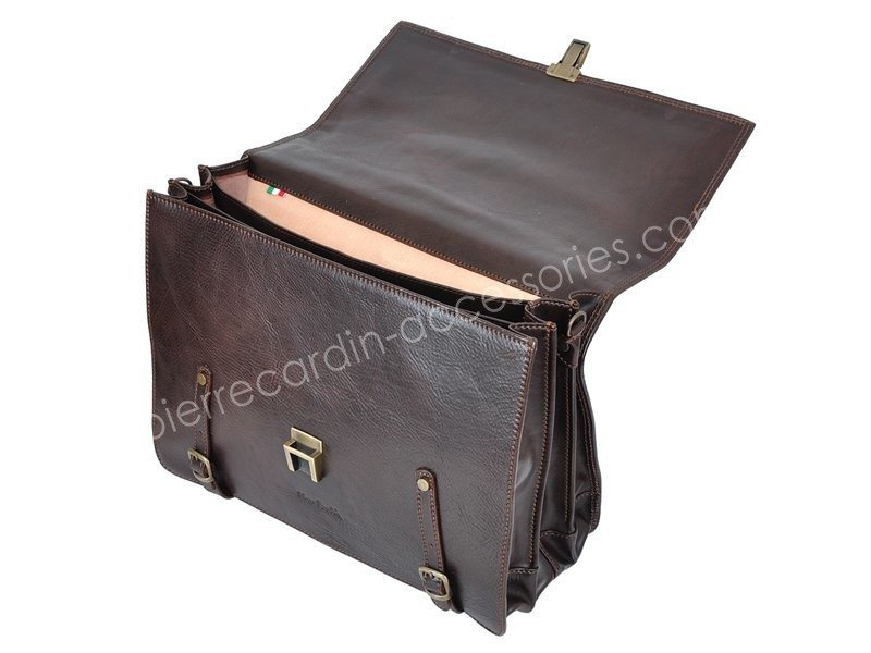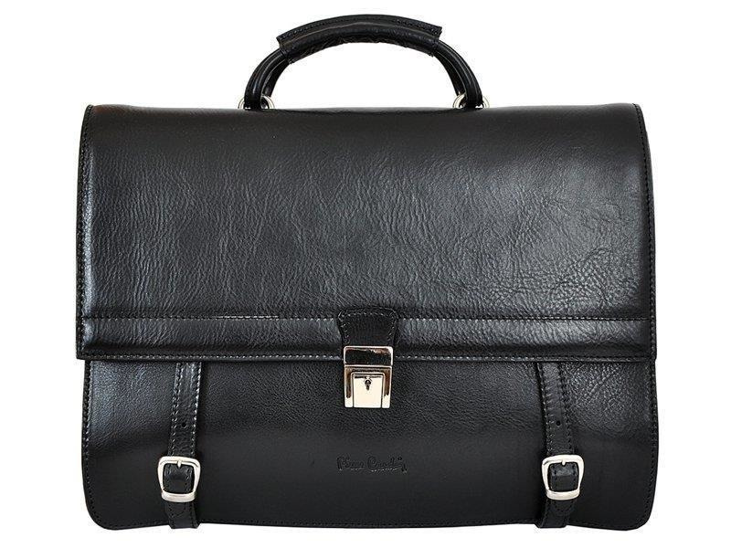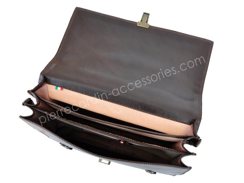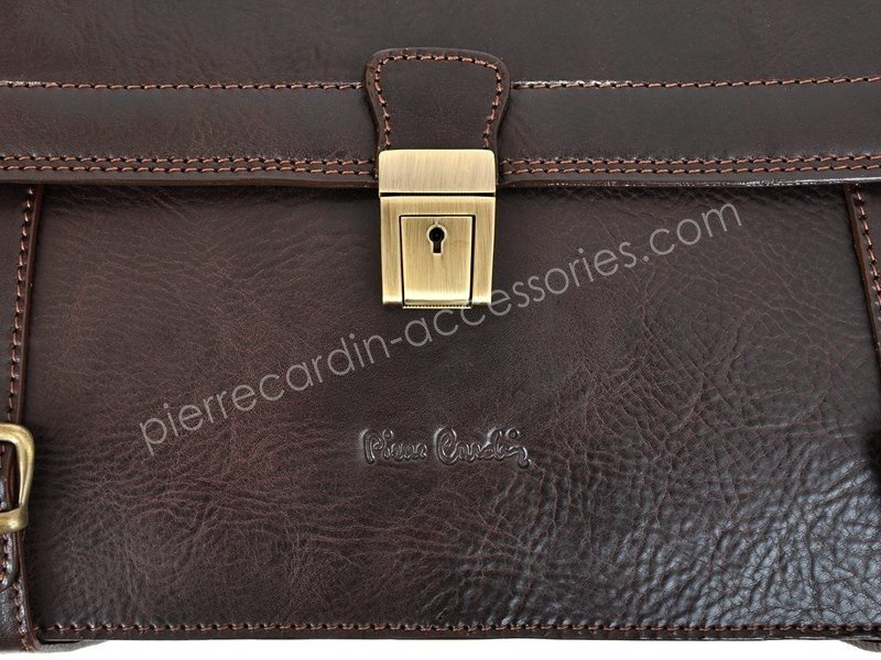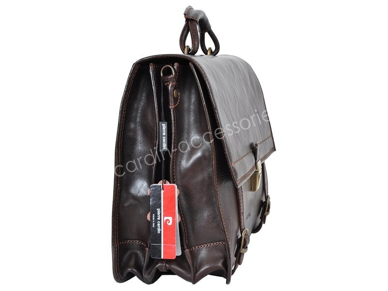 Elegancka, obszerna i funkcjonalna teczka o designie inspirowanym stylem "retro" Pierre Cardin. Wykonana z wysokogatunkowej, prawdziwej skóry bydlęcej, jednocześnie grubej i delikatnej w dotyku, z zachowanym naturalnym rysunkiem i fakturą skóry.