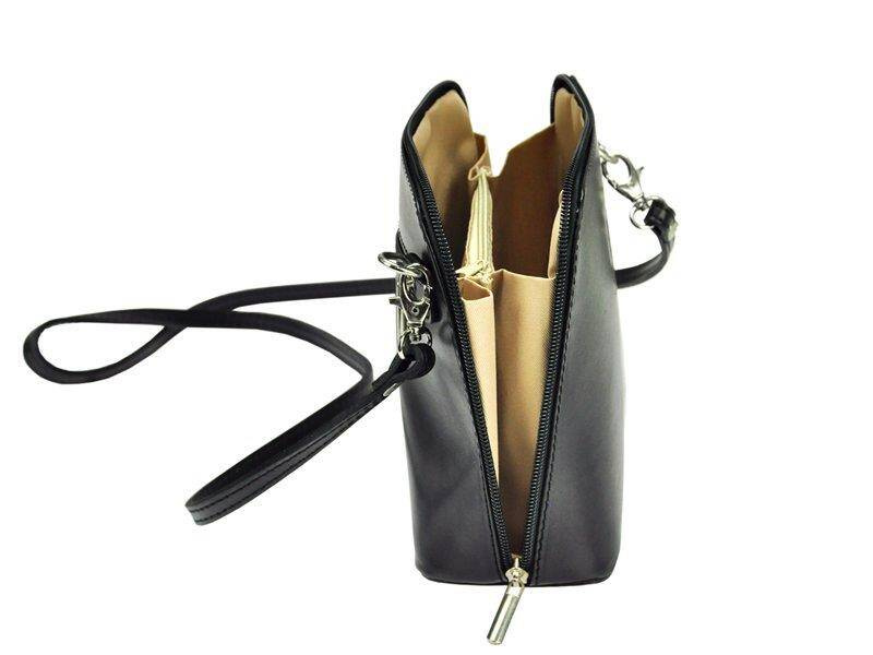 Piękna, malutka, jednokomorowa torebka, wykonana z naturalnej skóry licowej najwyższej jakości.