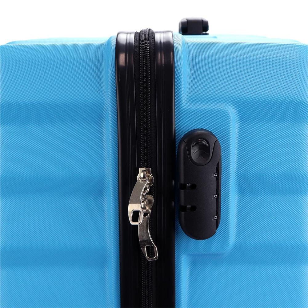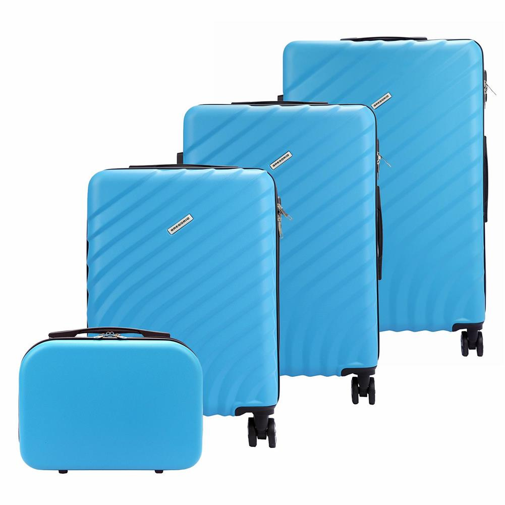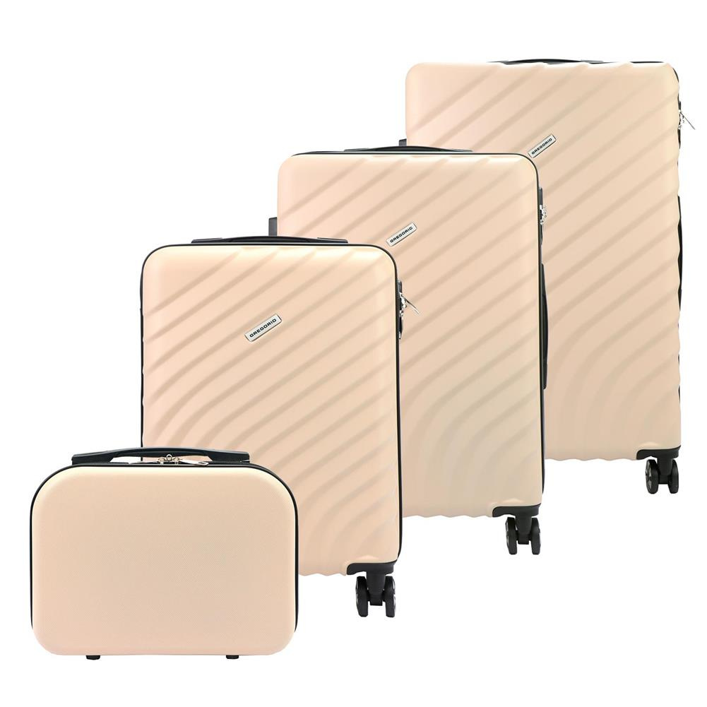 Zestaw składa się z trzech walizek w rozmiarach 20, 24 i 28 cali i kuferka na kosmetyki i drobiazgi w rozmiarze 14 cali..