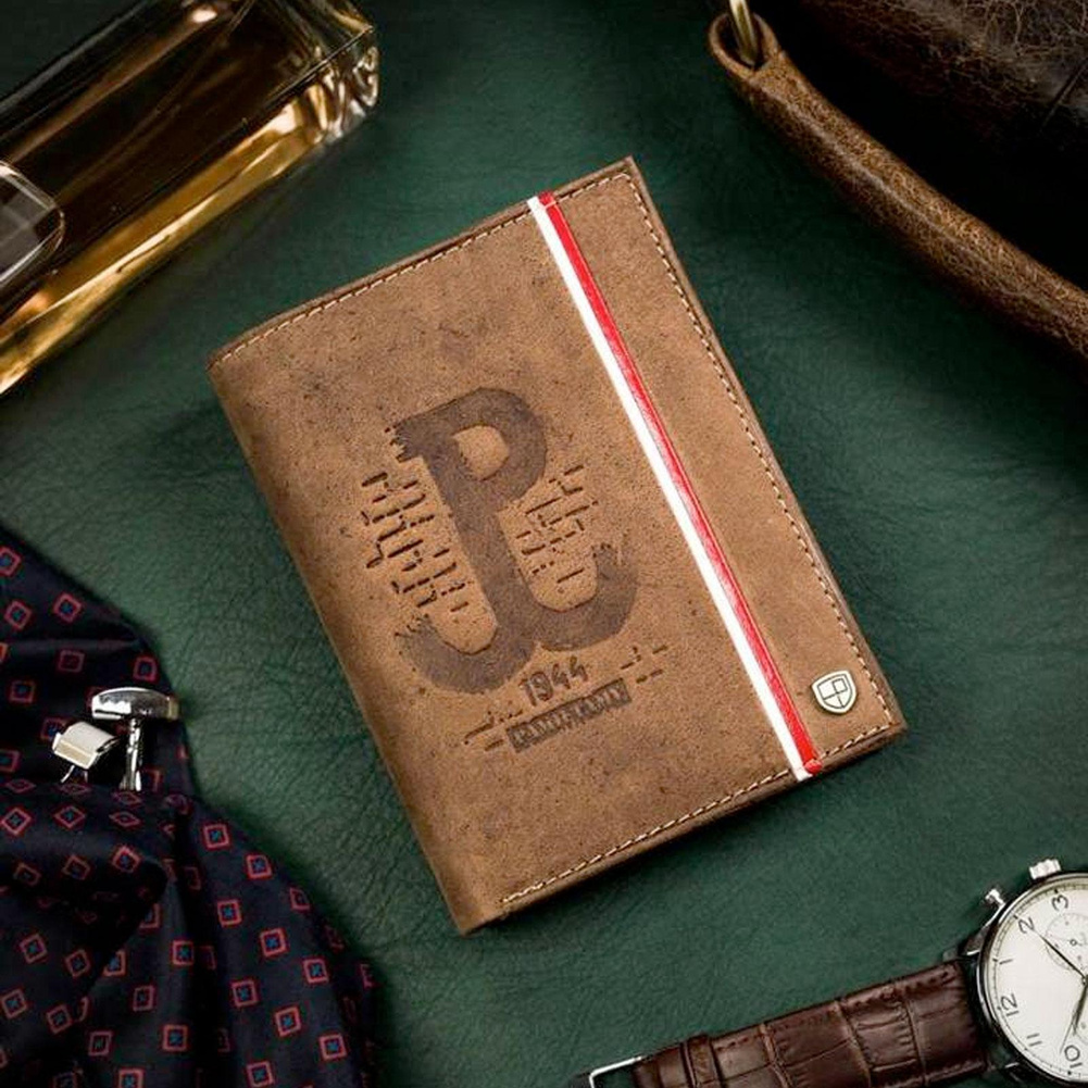 - Patriotyczny dodatek | Portfel o klasycznej stylistyce. Model w orientacji pionowej bez zapięcia zewnętrznego. Na froncie mieści się tłoczony motyw przedstawiający znak Polski Walczącej;