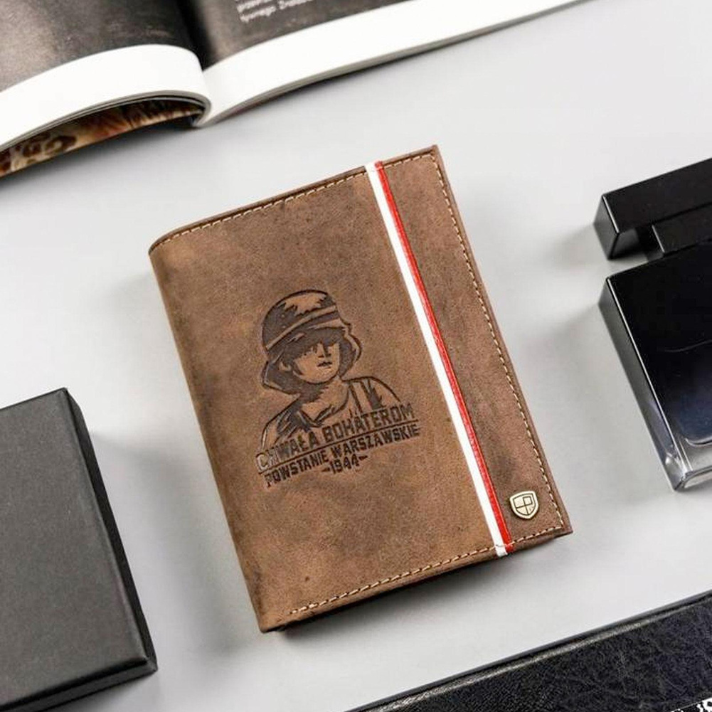 - Patriotyczny dodatek | Portfel o klasycznej stylistyce. Model w orientacji pionowej bez zapięcia zewnętrznego. Na froncie mieści się tłoczony motyw przedstawiający Małego Powstańca;