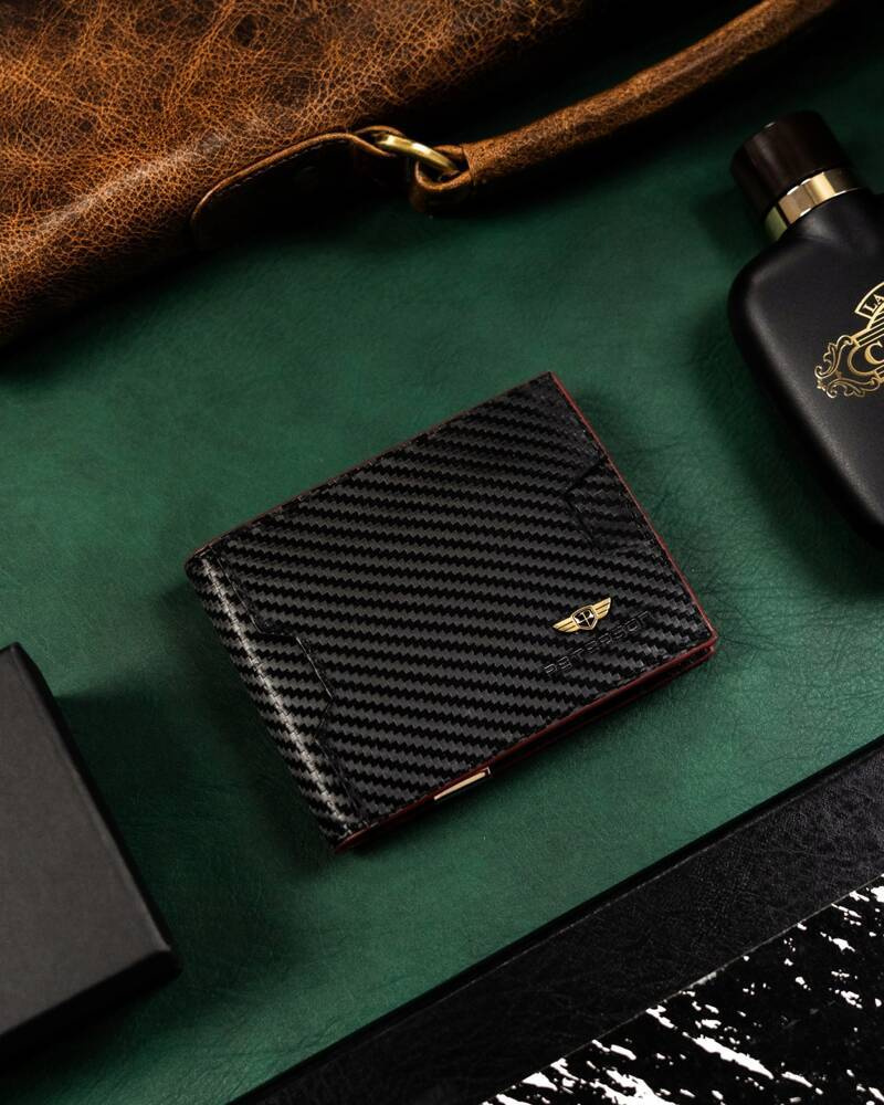 - Najwyższa jakość wykonania - portfel wykonany został z wysokiej jakości skóry naturalnej powleczonej z zewnątrz warstwą do złudzenia przypominającą włókno węglowe (carbon);