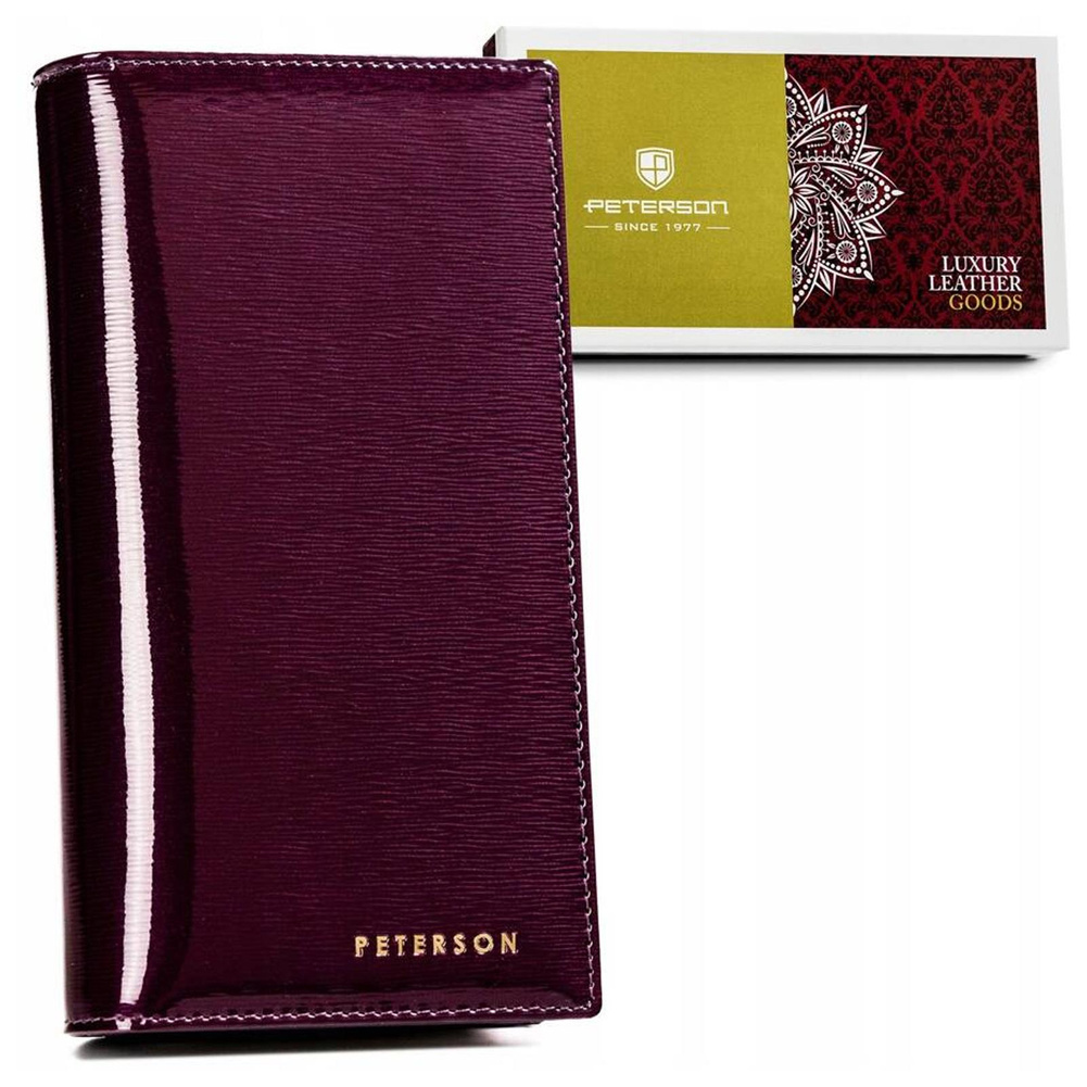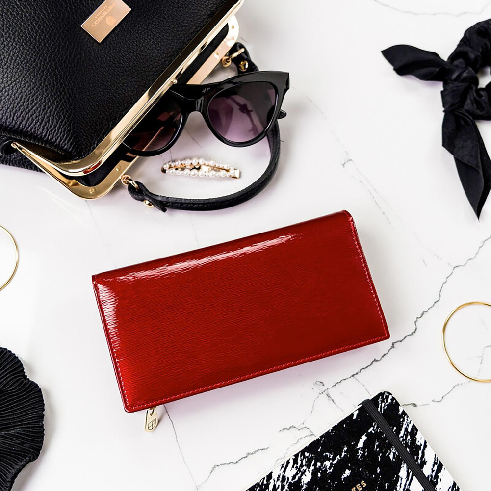 - Portfel ze skóry najwyższej jakości | Uszyty z lakierowanej skóry naturalnej, bardzo trwałej i przyjemnej w dotyku. Na zewnątrz ma gładką fakturę, w środku jej powierzchnia jest matowa i żyłowana.