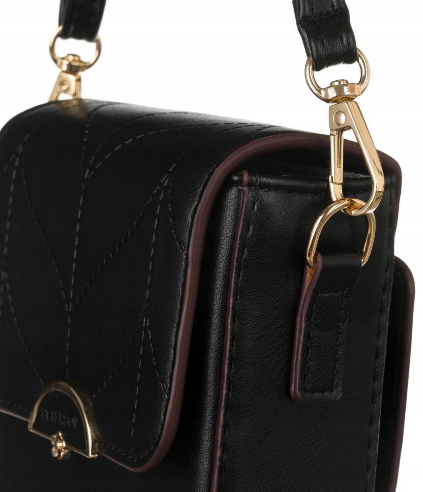 Na rewersie torebki umieszczono niewielką kieszeń zamykaną na zatrzask. Wewnątrz niej znajduje się 6 miejsc na karty, których używasz najczęściej i chcesz mieć zawsze pod ręką. Główna komora, zamykana klapką na zatrzask, została wyściełana na jasnej podszewce. Pozwala to uniknąć otarć na eko skórze, podczas wkładania i wyjmowania przedmiotów.