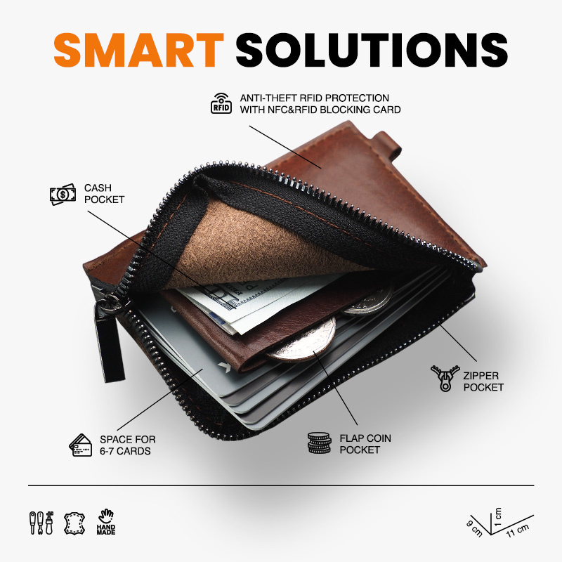 Rozmiar: 10,5 x 7 cm Materiał: Skóra Nomad Zawiera kartę blokującą sygnały NFC i RFID Kieszeń na banknoty Kieszeń na bilon Mieści 8 kart Miękki portfel wykonany z roślinnie garbowanej skóry Nomad. Daje łatwy dostęp do ośmiu kart płatniczych, bilonu oraz banknotów. Zapinany na mocny suwak. Zapakowany w pudełko prezentowe.