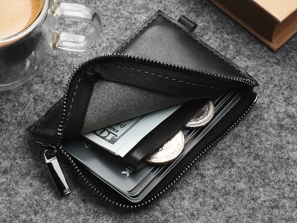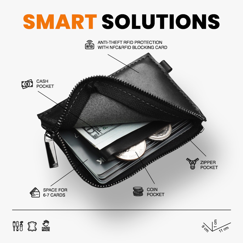 Rozmiar: 10,5 x 7 cm Materiał: Skóra Nomad Zawiera kartę blokującą sygnały NFC i RFID Kieszeń na banknoty Kieszeń na bilon Mieści 8 kart Miękki portfel wykonany z roślinnie garbowanej skóry Nomad. Daje łatwy dostęp do ośmiu kart płatniczych, bilonu oraz banknotów. Zapinany na mocny suwak. Zapakowany w pudełko prezentowe.