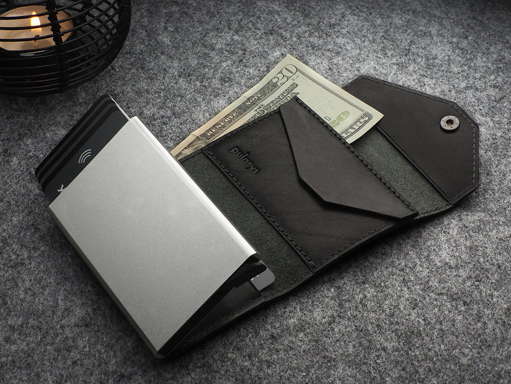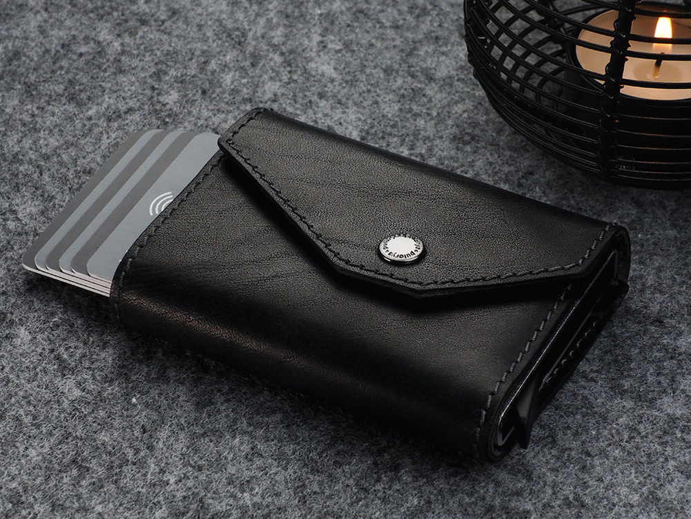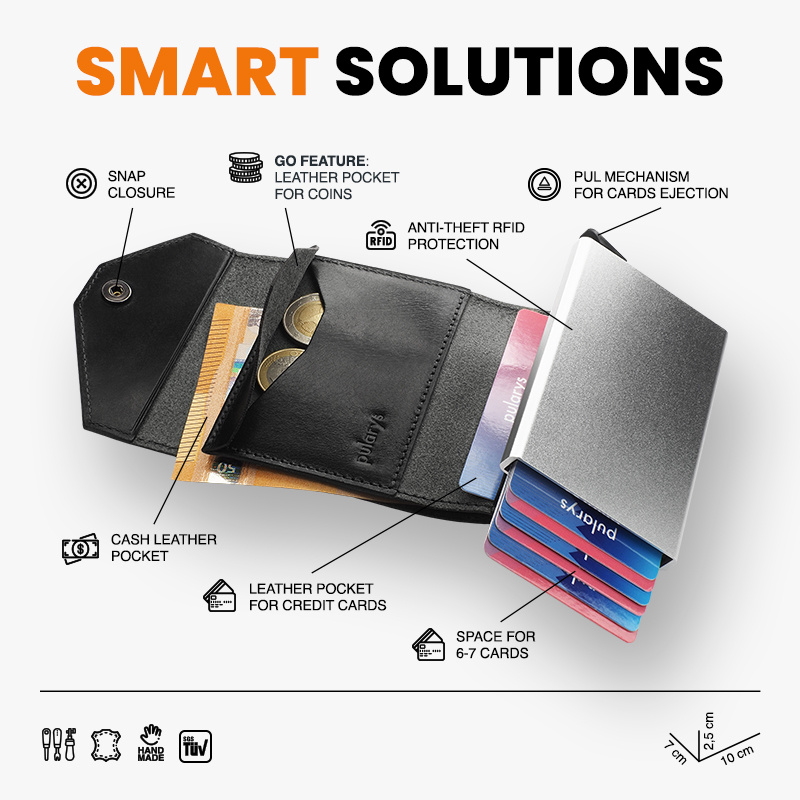 Rozmiar: 6,5 x 10 x 2,5 cm Materiał: Skóra Nomad Mieści 7 kart Kieszeń na banknoty Kieszonka na monety Wzór zarejestrowany ® Zabezpieczenie RFID Przechowa wiele kart płatniczych i dokumentów. Specjalny mechanizm stopniowego wysuwania kart - "pul", zapewnia do nich szybki i łatwy dostęp. Dodatkowa kieszeń na banknoty oraz kieszonka na bilon. Dzięki zastosowanej w jego konstrukcji technologii blokowania RFID, Twoje dane oraz środki na kartach płatniczych są całkowicie bezpieczne i chronione przed nieautoryzowanym skanowaniem lub kradzieżą. Portfel został starannie zapakowany w eleganckim pudełku .