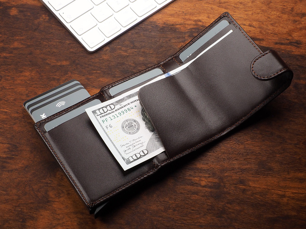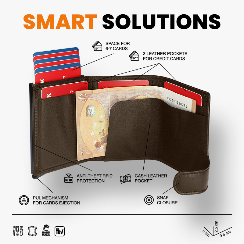 Rozmiar: 7,5 x 9,5 x 2,5 cm Materiał: Skóra Italia Kieszeń na banknoty Mieści 9 kart Wzór zarejestrowany ® Zabezpieczenie RFID Wykonany z delikatnej, ekskluzywnej skóry Italia. Karty, banknoty - masz je zawsze pod ręką, uporządkowane w kilku łatwo dostępnych kieszonkach. Stopniowo wysuwający karty mechanizm "pul" zapewnia łatwy i szybki dostęp do zawartości portfela. Dzięki technologii blokowania RFID , Twoje dane oraz środki na kartach płatniczych są całkowicie bezpieczne i chronione przed nieautoryzowanym sczytaniem lub kradzieżą. Portfel został zapakowany w eleganckie pudełko.