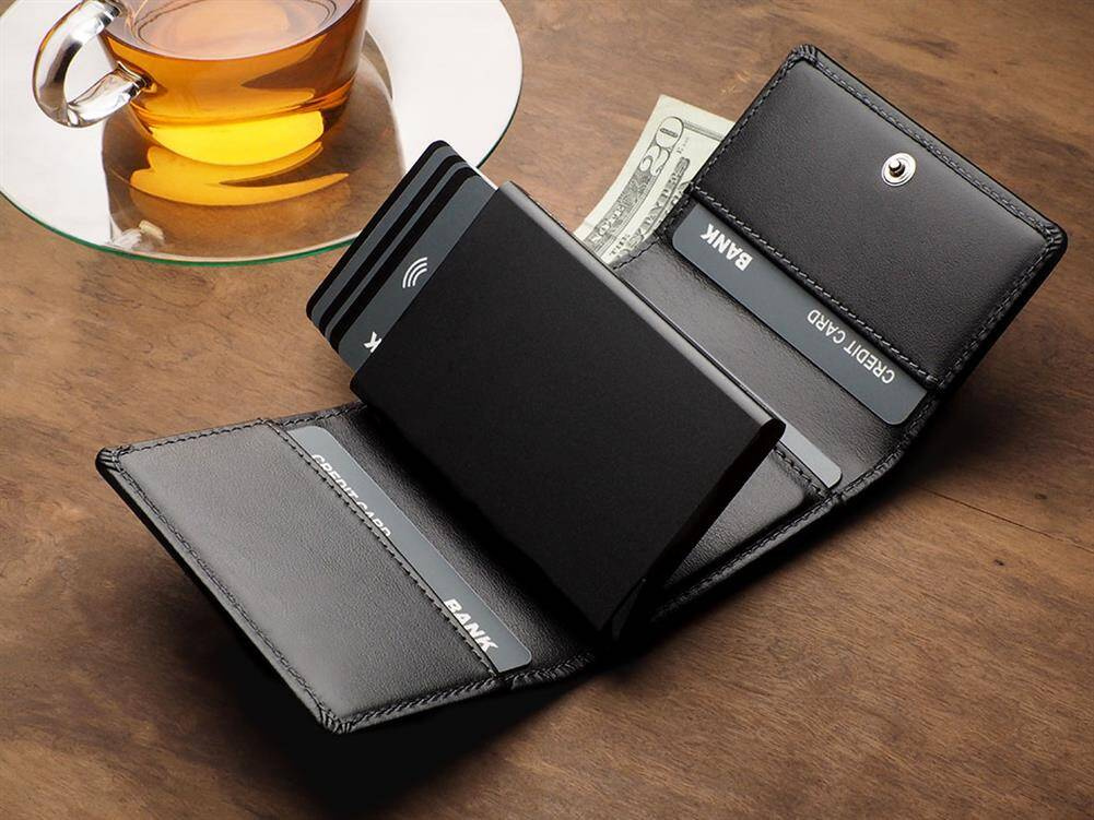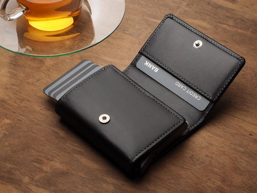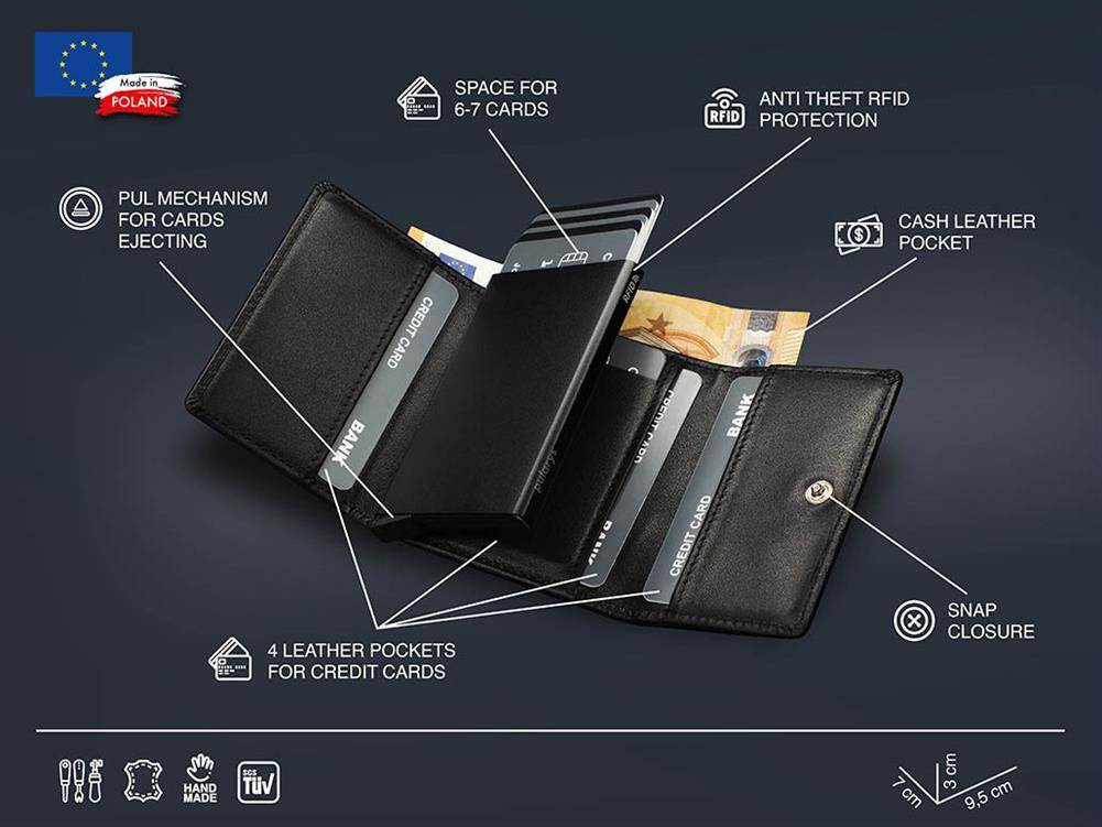 Rozmiar: 7 x 9,5 x 2,5 cm Materiał: Skóra Italia Kieszeń na banknoty Mieści 10 kart Wzór zarejestrowany ® Zabezpieczenie RFID Zapięcie na zatrzask Wykonany z delikatnej skóry Italia. Przechowa wiele kart i dokumentów, zapewniając do nich łatwy dostęp, dzięki specjalnemu mechanizmowi stopniowego wysuwania kart. Dodatkowa, kieszonka na banknoty, klapka zapinana na zatrzask . Dzięki technologii blokowania RFID. Twoje dane oraz środki na kartach płatniczych są całkowicie bezpieczne i chronione przed nieautoryzowanym sczytaniem lub kradzieżą. Portfel został zapakowany w elegancie pudełko.