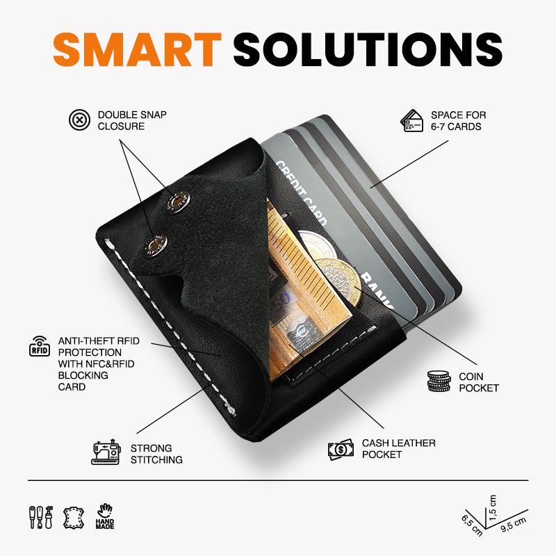 Rozmiar: 9,5 x 6,5 x 1,5 cm Materiał: Skóra Italia Zawiera kartę blokującą sygnały NFC i RFID Kieszeń na banknoty Kieszeń na bilon Mieści 8 kart Wzór zarejestrowany ® Zapięcie na 2 zatrzaski Wykonany z miękkiej skóry Italia. Starannie dopracowany. Zdumiewająco pojemny - przechowa wiele kart i dokumentów, zapewniając do nich łatwy dostęp. Dwie kieszonki: na banknoty i bilon pomogą Ci uporządkować zawartość. Zapakowane w pudełko prezentowe .