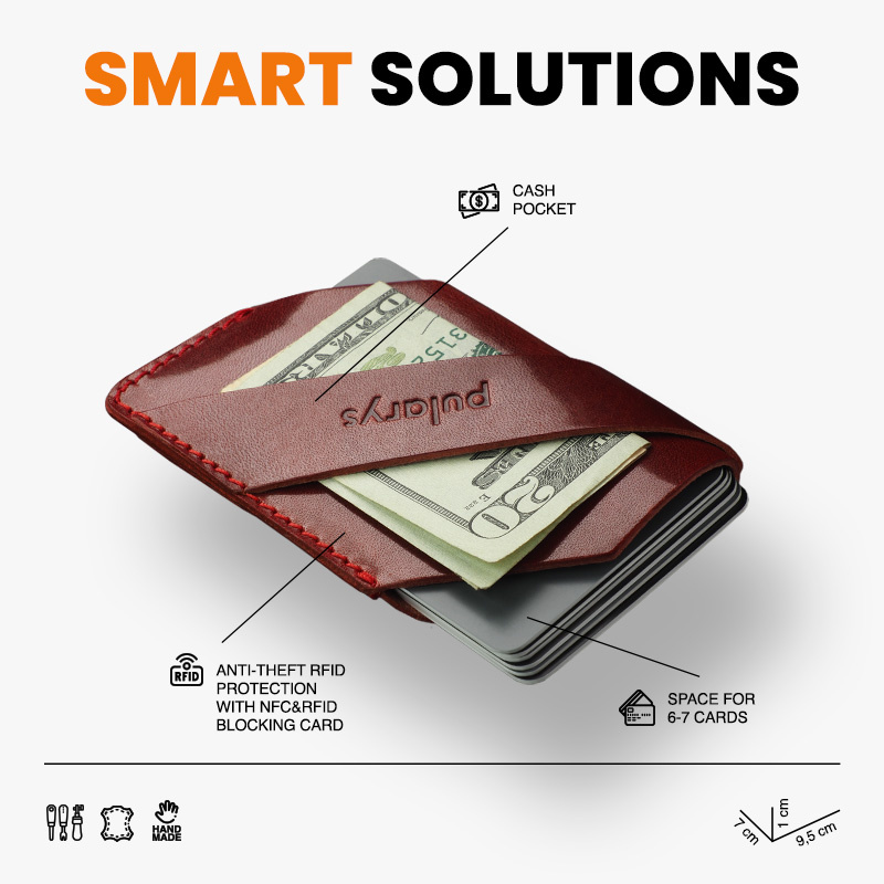 Rozmiar: 7 x 9,5 cm Materiał: Skóra Nomad Mieści 7 kart Zawiera kartę blokującą sygnały NFC i RFID Kieszeń na banknoty Portfel wykonany z roślinnie garbowanej skóry Nomad . Niewielki rozmiarem, przechowa wiele kart płatniczych oraz banknoty. Zmieści się w każdej kieszeni. Zapakowany w eleganckie pudełko