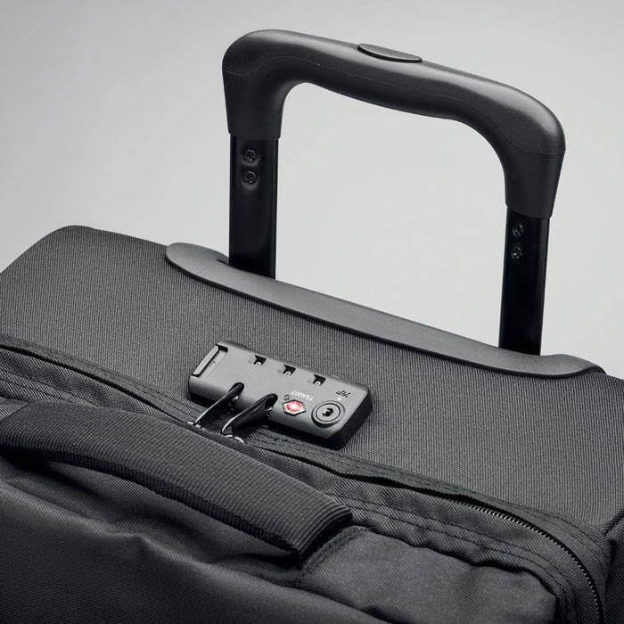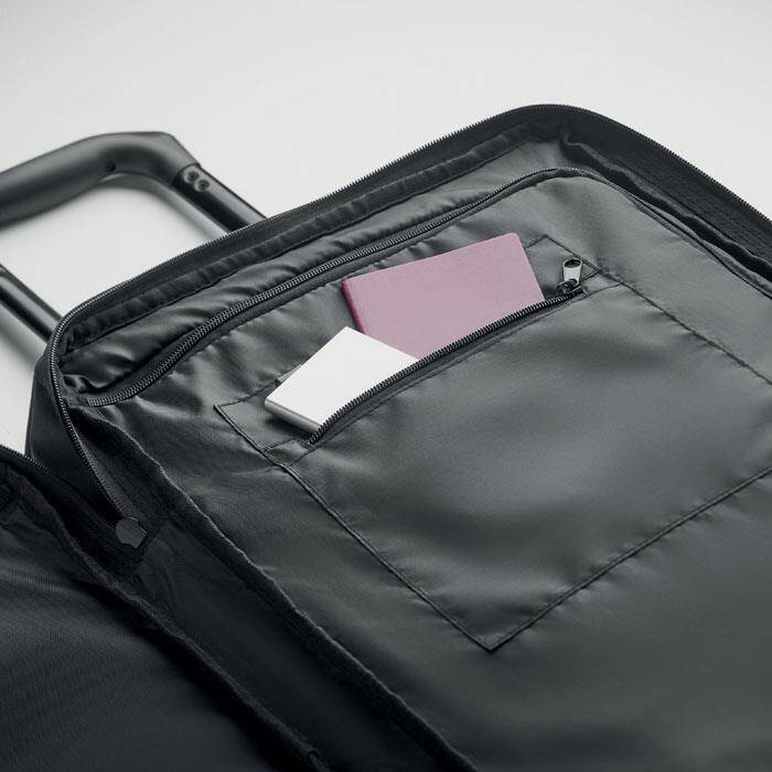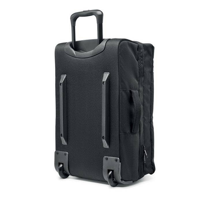 Walizka z poliestru 600D RPET. Dwie duże kieszenie wewnętrzne zapinane na zamek błyskawiczny. Jedna przednia kieszeń zapinana na zamek błyskawiczny oraz górne, boczne i dolne uchwyty. W zestawie zamek szyfrowy i podwójna rama rurowa. 2 kółka.