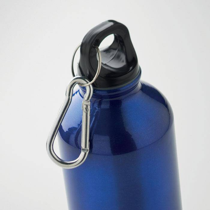 Jednościenna butelka z aluminium z recyklingu z karabińczykiem.