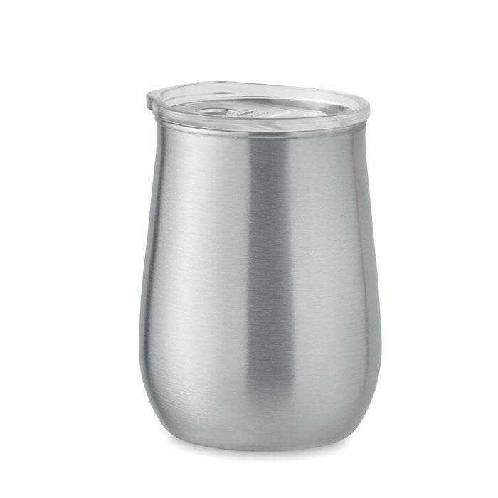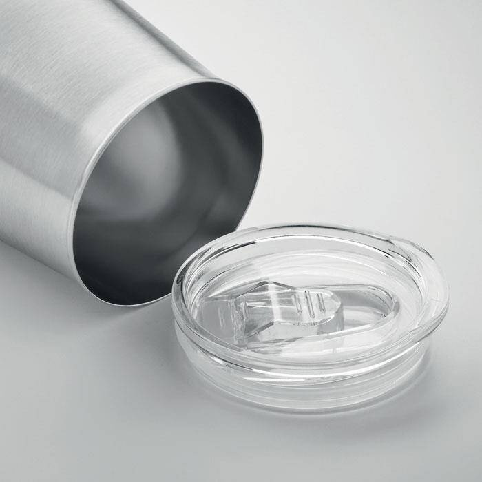 Kubek ze stali nierdzewnej z recyklingu (90% recyklingowanej stali nierdzewnej i 10% stali nierdzewnej) malowany proszkowo z pokrywką z zasuwanym otworem do picia. Pojemność: 500 ml.