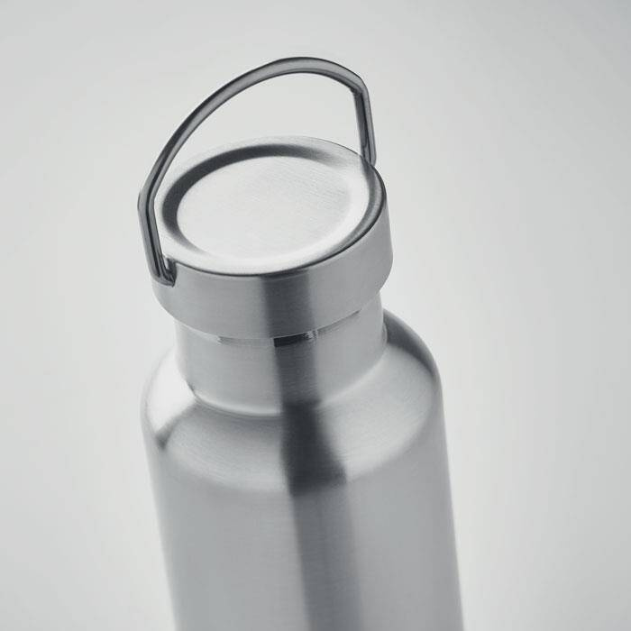 Dwuścienna, izolowana próżniowo butelka ze stali nierdzewnej z recyklingu (90% recyklingowanej stali nierdzewnej i 10% stali nierdzewnej) z zakrętką z uchwytem.