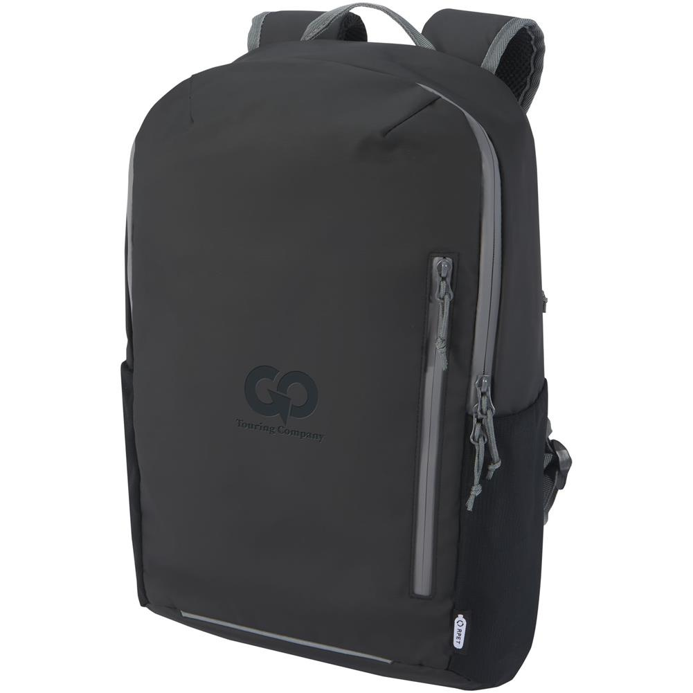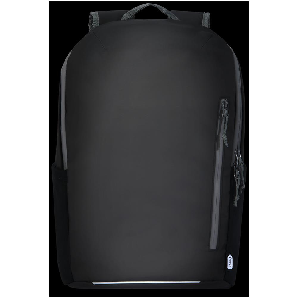 Wodoodporny plecak na laptopa wykonany z materiałów z recyklingu posiadających certyfikat GRS, w tym zamków błyskawicznych. Posiada wyściełaną przegrodę na 15-calowego laptopa z bocznym otworem zapewniającym szybki dostęp, wiele kieszeni z siatki, przednią kieszeń zapinaną na zamek oraz odblaskowe lamówki zapewniające widoczność. Wyprofilowany i wyściełany spód oraz regulowany pasek na klatkę piersiową sprawiają, że jest wygodny do noszenia nawet, gdy jest w pełni załadowany. Materiały z recyklingu GRS obejmują główny materiał, podszewkę, taśmy i zamki błyskawiczne. Pojemność: 21 litrów. Wolne od PVC.