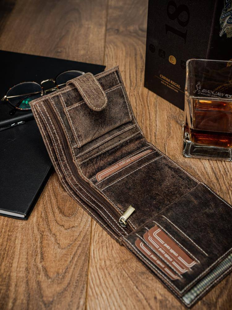 - Portfel odszyty z naturalnej skóry bydlęcej w brązowym kolorze, z którym zawsze będziesz czuć się dobrze!