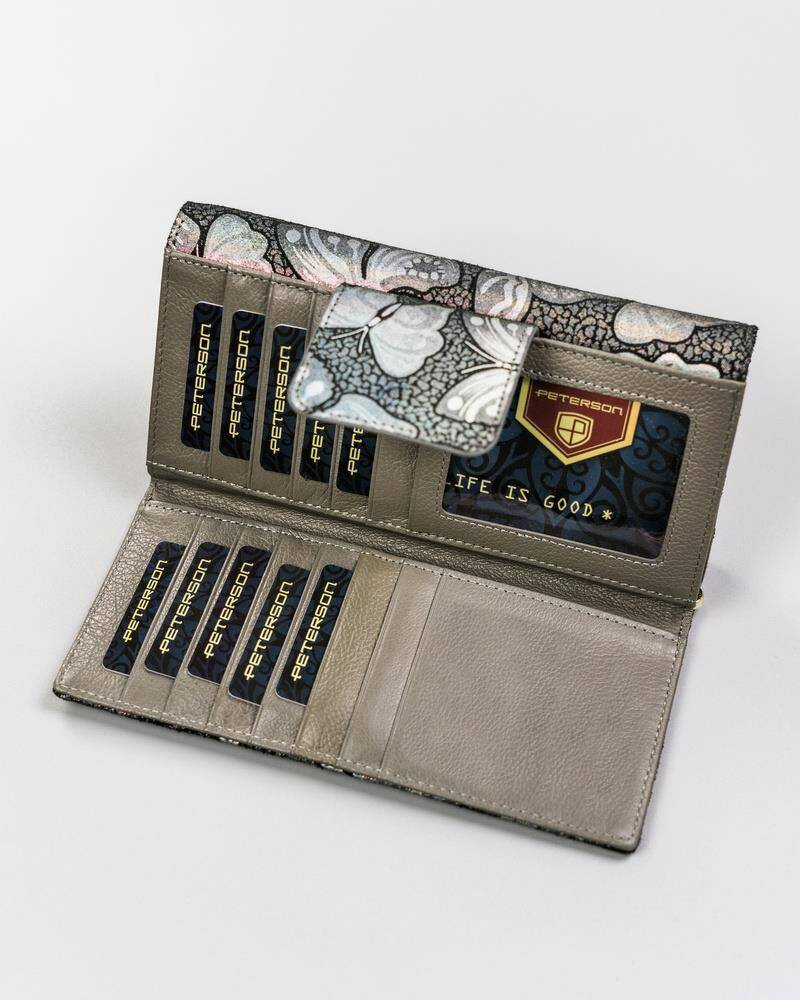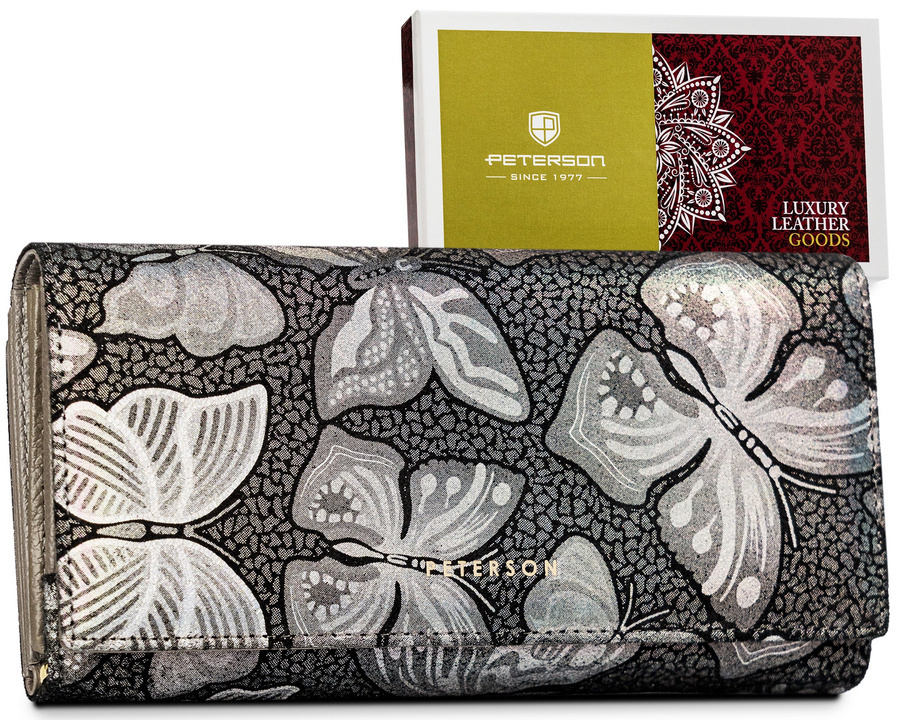- Klasyczny fason z oryginalnymi detalami | Portfel o klasycznej stylistyce i nietypowym holograficznym wzorze w motylki. Model w orientacji poziomej, zapinany bezpiecznym i trwałym zatrzaskiem, dodatkowo na froncie portfela widnieje złote logo marki;