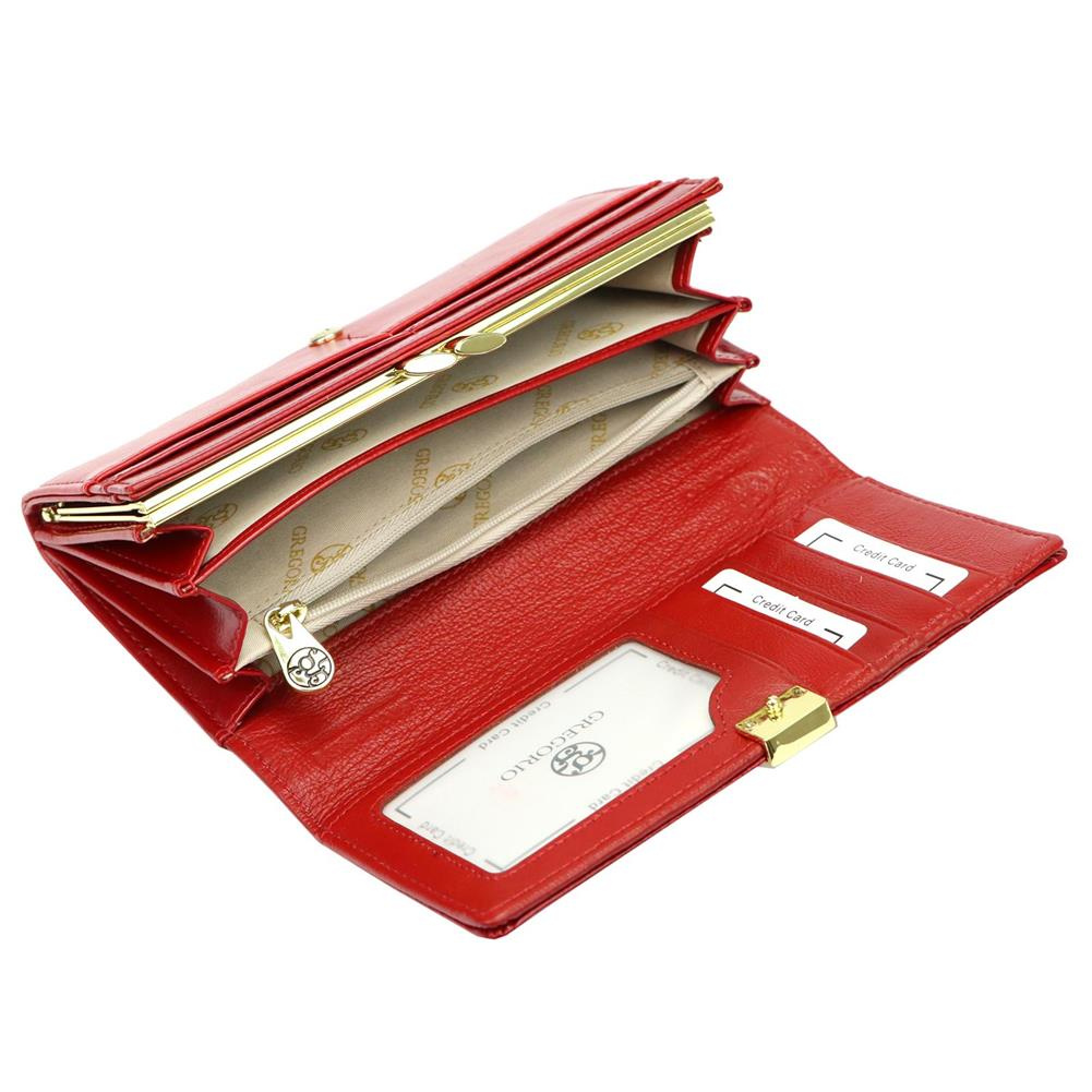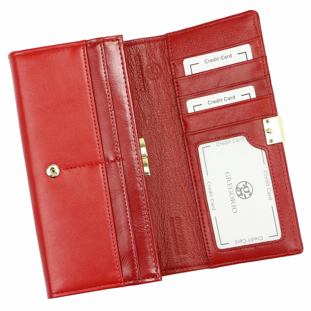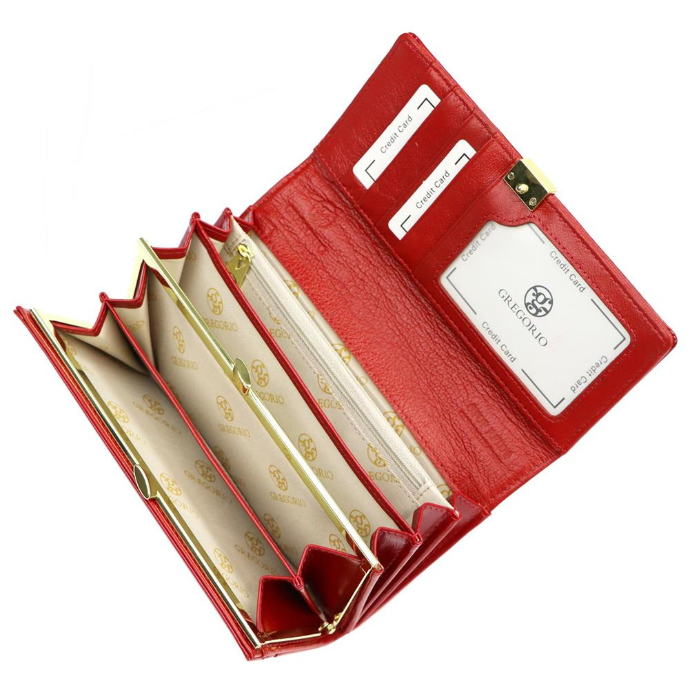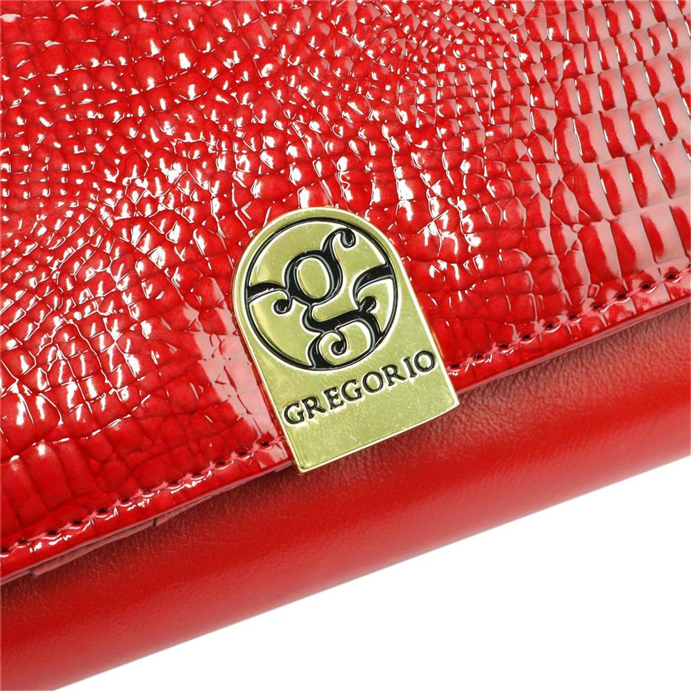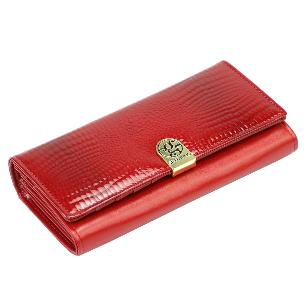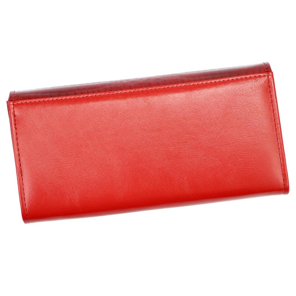 Duży portfel damski, wykonany z najwyższej jakości naturalnej, włoskiej skóry licowej, częściowo wytłoczonej w rysunek skóry krokodyla i lakierowanej.