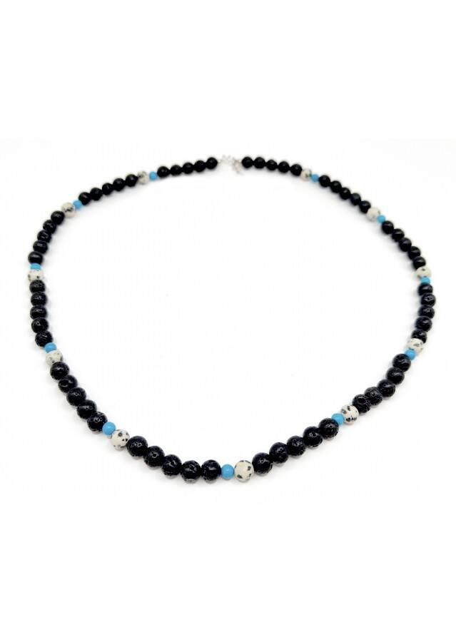 Naszyjnik wykonany z użyciem srebra próby 925 , rodowanego Kamień: Jaspis+ Lawa+ Howlit Rozmiar kamienia: /64mm Długość: 47 cm- 50 cm z przedłużką Rozmiar uniwersalny. Produkt wykonywany ręcznie.