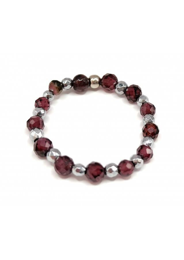 Kamień: Granat+ Hematyt + srebrny element Pierścionek wykonany na bardzo wytrzymałej gumce, odpornej na uszkodzenia.  Rozmiar kamienia: 2/3 mm Rozmiar uniwersalny. Produkt wykonywany ręcznie