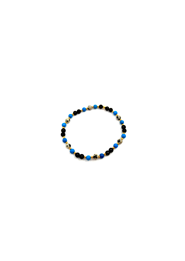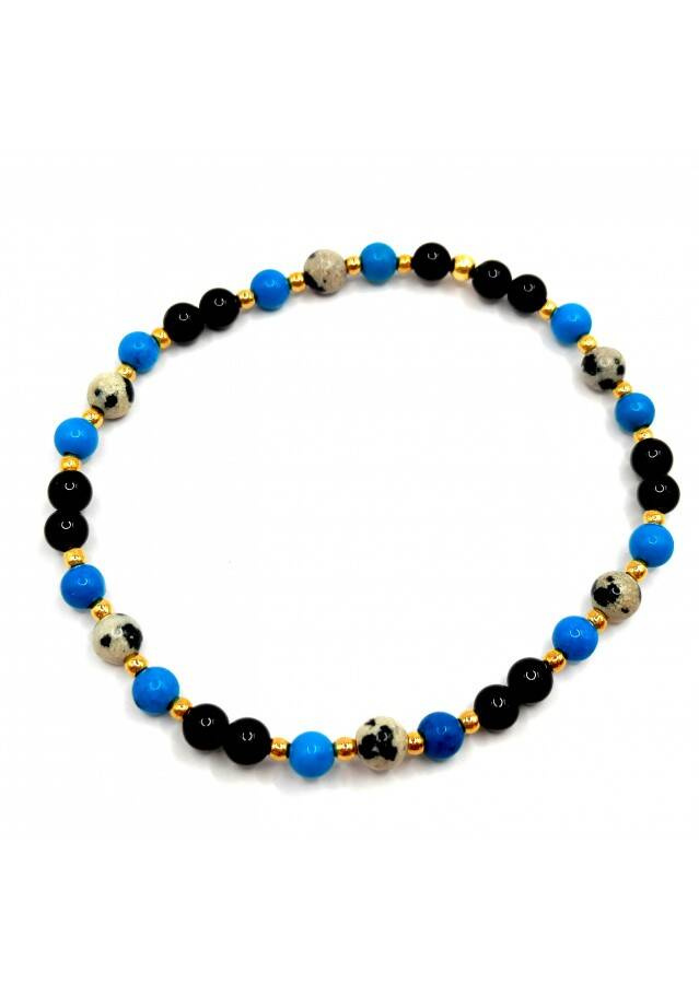 Bransoletka wykonana ze srebra próby 925, pozłacanego 24 karatowym złotem. Kamień: Agat + Howlit + Jaspis i Hematyt Rozmiar kamienia: 4/2mm Długość: 17,5 cm  Zapięcie: gumka Bransoletka może być wykonana na zapięciu- prosimy o informację w uwagach do zamówienia Biżuteria ręcznie wykonana, produkt Polski.