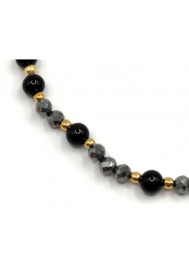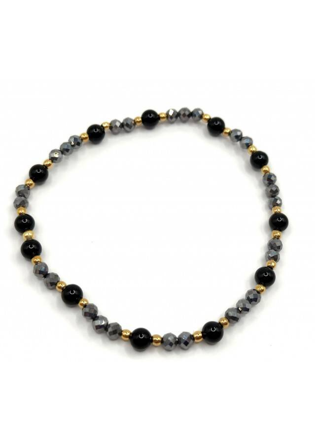 Bransoletka wykonana ze srebra próby 925, pozłacanego 24 karatowym złotem. Kamień: Agat+ Teraherz i Hematyt Rozmiar kamienia: 4/2mm Długość: 17,5 cm  Zapięcie: gumka Bransoletka może być wykonana na zapięciu- prosimy o informację w uwagach do zamówienia Biżuteria ręcznie wykonana, produkt Polski.