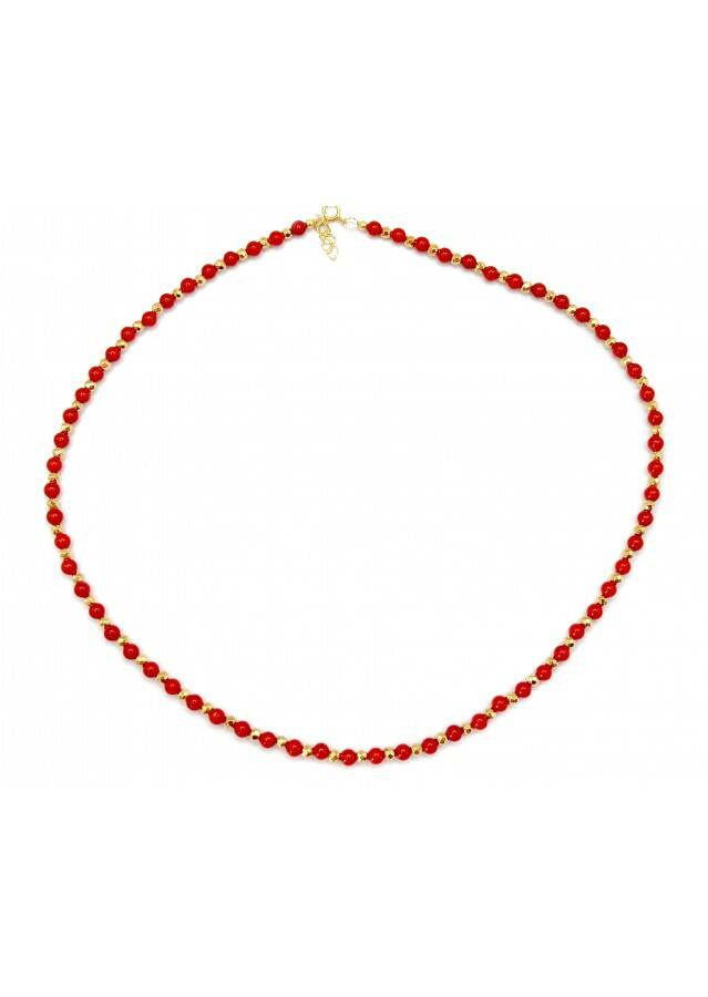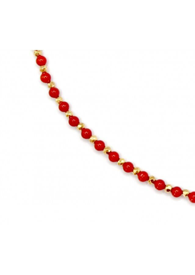 Naszyjnik wykonany ze srebra próby 925, pozłacanego 24 karatowym złotem. Kamień: Koral + Hematyt Rozmiar kamienia: 4/2 mm Długość: 44 cm  Długości do wyboru: 38 cm /42 cm/ 44 cm Zapięcie: klasyczne (federing) Biżuteria ręcznie wykonana, produkt Polski.