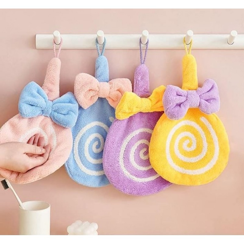 Szybkoschnący ręcznik do rąk na sznurku - wzór lizak z kokardą Uroczy i świetnie wchłaniający wodę ręcznik do rąk Pochłania 20% więcej wody, niż zwykły ręcznik. Posiada praktyczną zawieszkę, czas wchłaniania: 5 - 10 sekund  Wymiary: 30 cm x 20 cm    Materiał: Mikrofibra