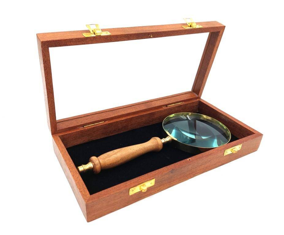 Lupa do czytania w pudełku Zestaw NC102386 Lupa specyfikacja: • Materiał wykonania: szkło, mosiądz, drewno • Kolor: złoty, brązowy • Rączka drewniano-mosiężna • Wymiary: 23,5 cm x O 10 cm Pudełko: • Materiał wykonania: drewno, szkło • Kolor: brązowy • Wewnątrz wyściełane materiałem • Wymiary: 25,5 x 14 x 5 cm