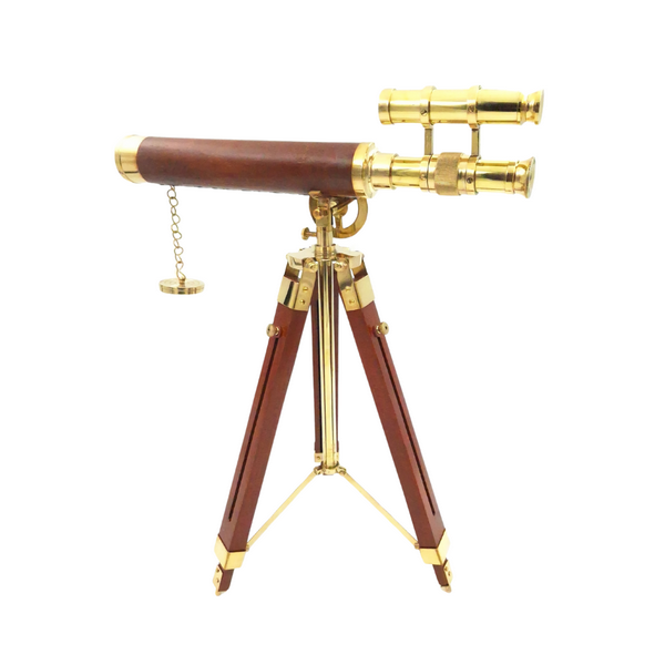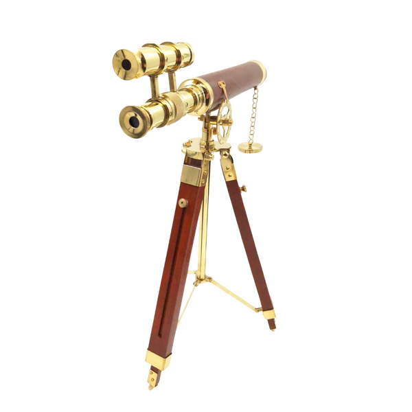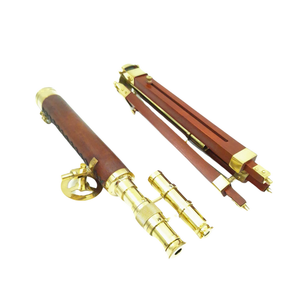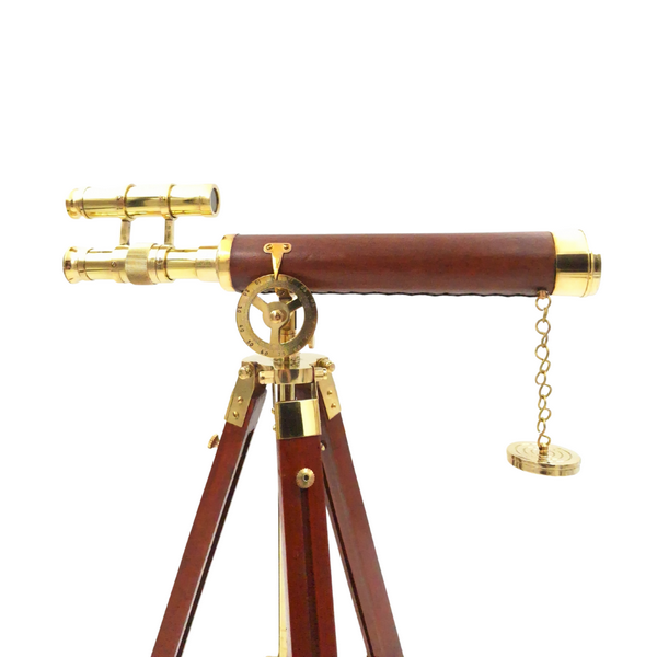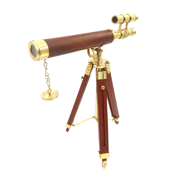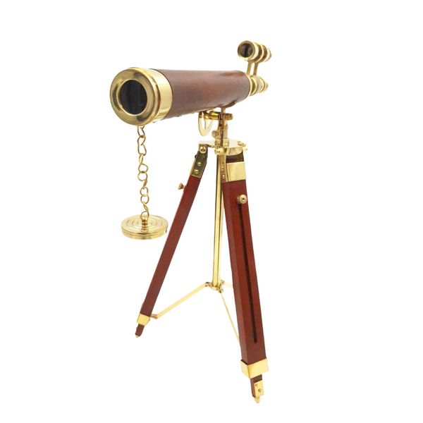 Duża, mosiężna luneta na trójnogu - Wysokość maksymalna 57 cm – TDBL Duża, mosiężna luneta na drewnianym trójnogu to piękny element dekoracyjny w stylu retro. Doskonały pomysł na oryginalny pomysł. Regulowana wysokość trójnoga. Wysokość maksymalna: 57 cm Długość lunety 36,5 cm.