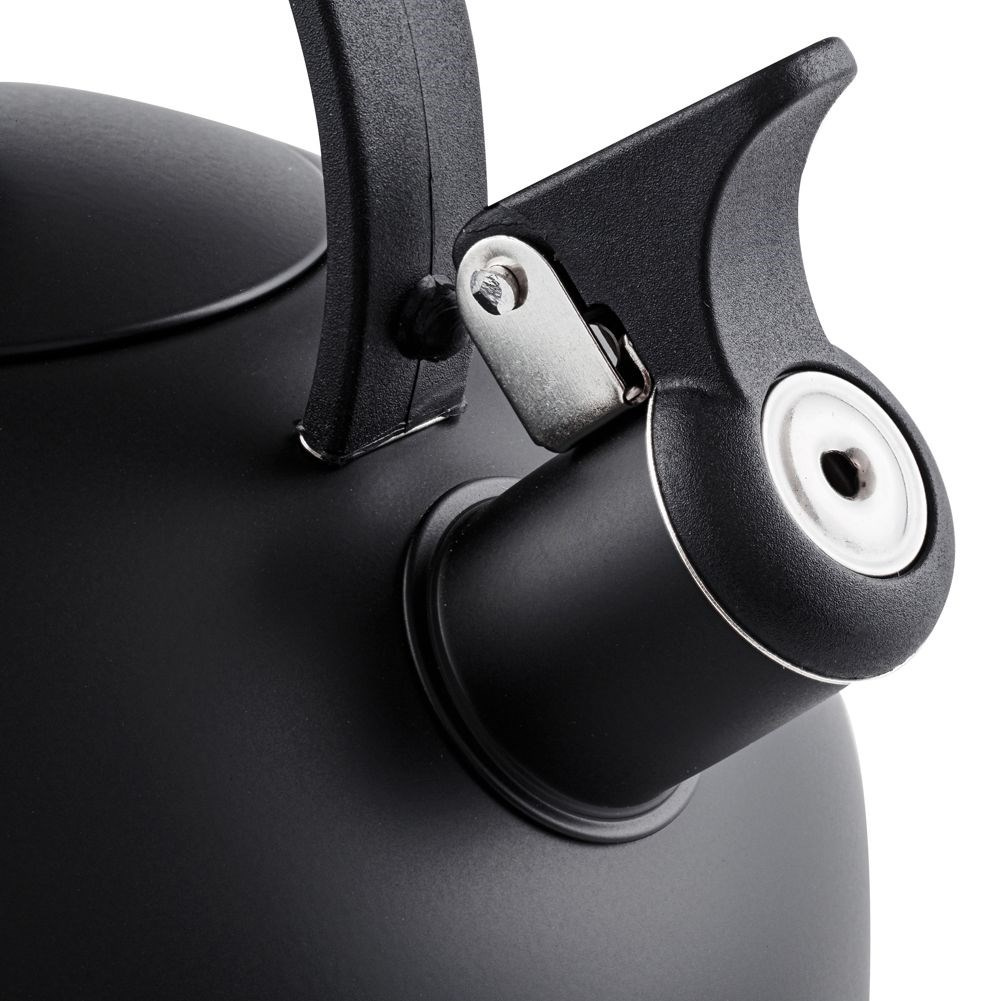 - Czajnik z uchylnym gwizdkiem. Wykonany ze stali nierdzewnej w matowym, czarnym kolorze. Do stosowania na wszystkich rodzajach kuchenek.