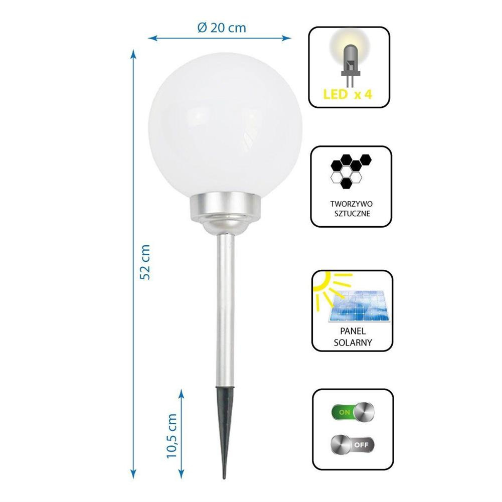 Solarne lampy ogrodowe cieszą się dużym zainteresowaniem i doskonałymi opiniami użytkowników. Nic dziwnego. To najlepsze i zdecydowanie najtańsze źródło energii elektrycznej. OGRODOWA LAMPA SOLARNA KULA MLECZNA ŚR. 20CM 4 LED jest bardzo praktycznym rozwiązaniem. Po zmroku będzie nieco więcej światła, dzięki czemu nie potkniesz się, nie narazisz na upadek, a Twoi goście znajdą drogę do wyjścia. Dzięki niskiej intensywności światła, lampa może też stanowić ciekawe uzupełnienie kompozycji roślinnych. OGRODOWA LAMPA SOLARNA KULA MLECZNA ŚR. 20CM 4 LED najlepiej prezentuje się z kilkoma egzemplarzami w różnych, bądź tych samych wielkościach, podkreślając atmosferę ogrodu i zachwycając grą świateł i cieni zarówno latem jak i zimą. Stwórz swoją galaktykę z OGRODOWĄ LAMPĄ SOLARNĄ KULĄ MLECZNĄ ŚR. 20CM 4 LED