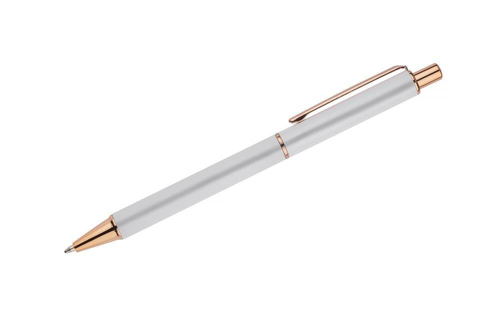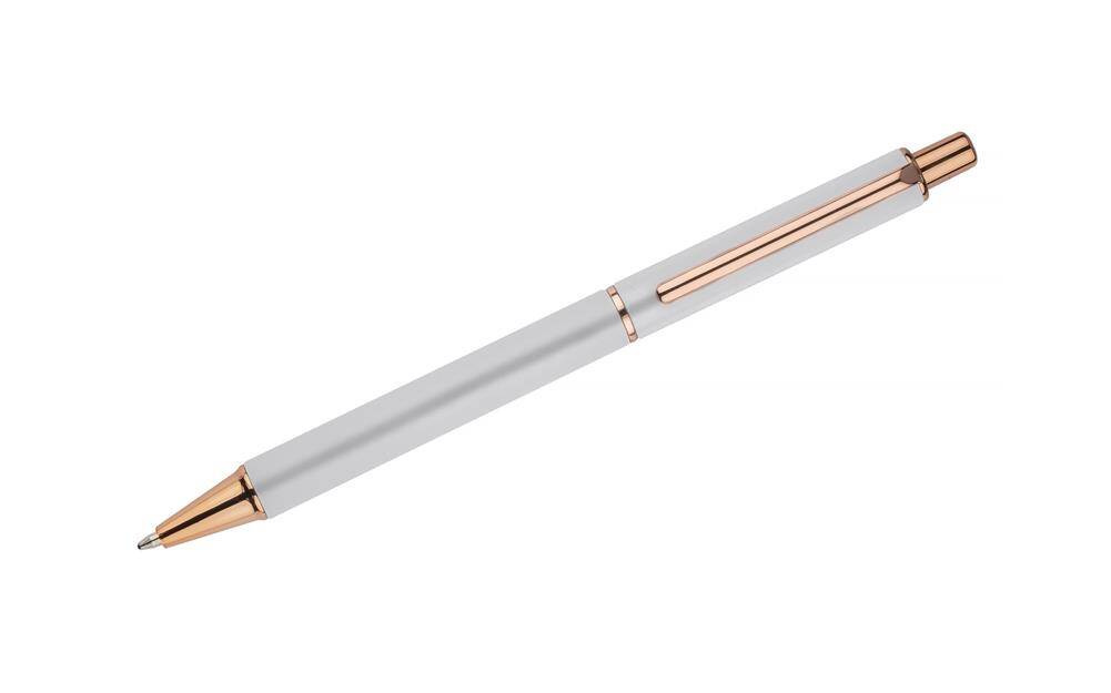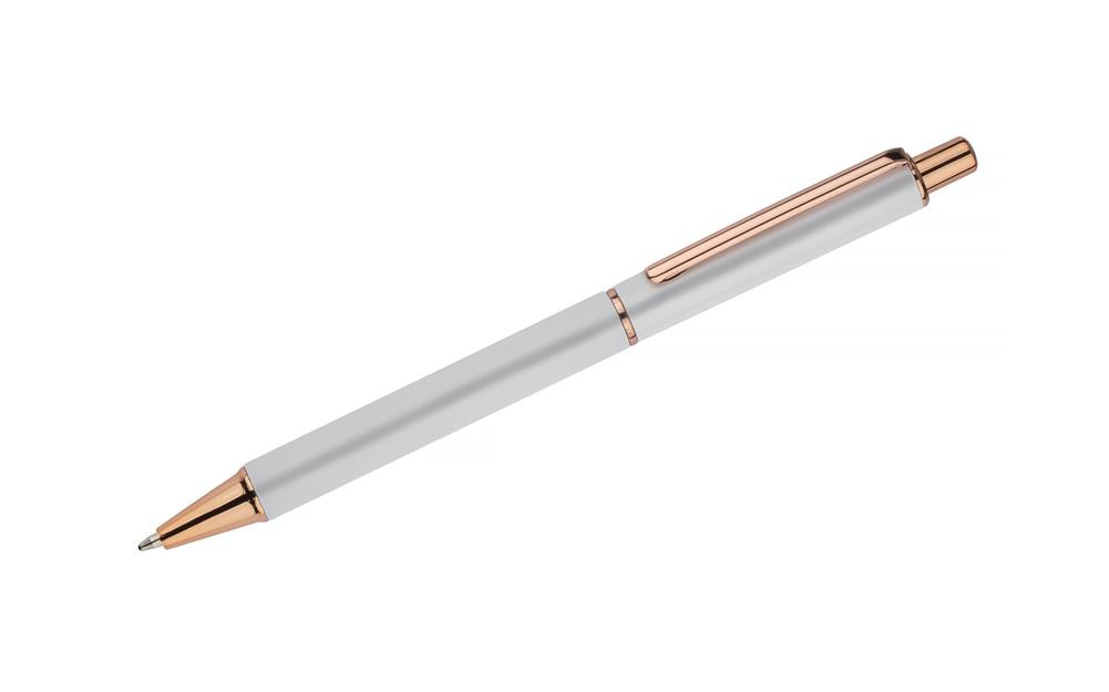 Matowy długopis z akcentami w kolorze różowego złota. Korpus oraz klips wykonane z metalu