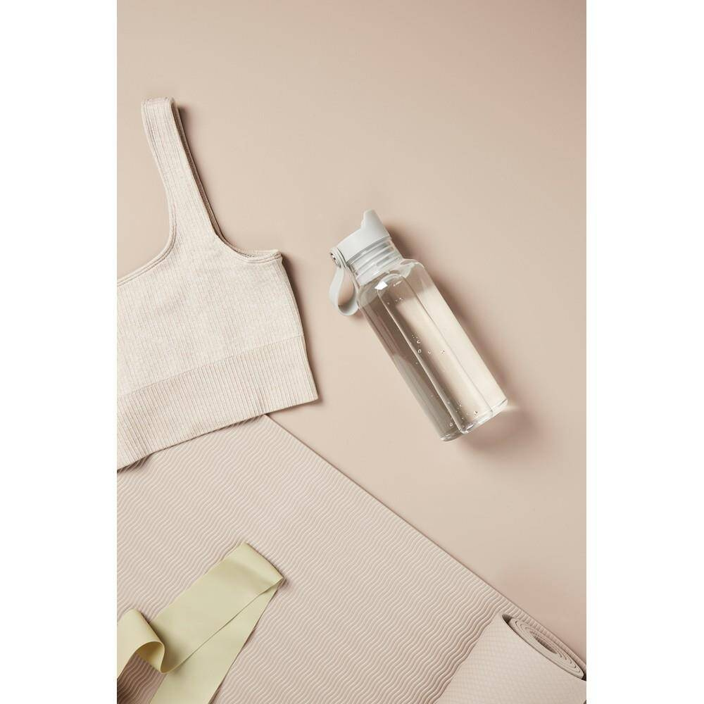 Butelka sportowa 600 ml, wykonana z RPET, całkowita zawartość materiałów z recyklingu obliczona na podstawie wagi całkowitej przedmiotu: 63%, nadaje się wyłącznie do zimnych napojów, zalecane mycie ręczne, w pudełku z papieru kraftowego z certyfikatem FSC.