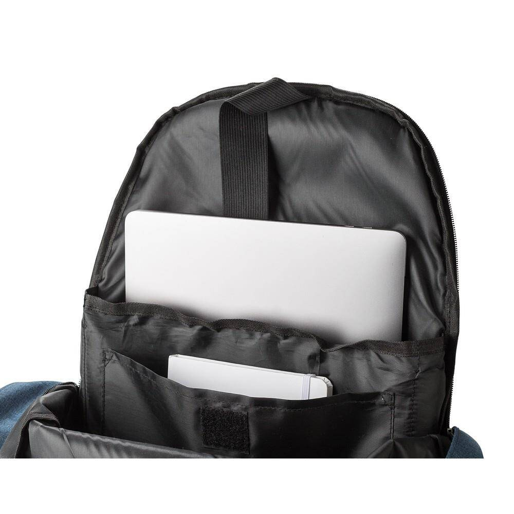Plecak chroniący przed kieszonkowcami, z paskiem na walizkę, przednia kieszeń na zamek błyskawiczny, dwie kieszenie boczne, wewnątrz duża przegroda główna z przegrodą na laptopa zamykaną na rzep, regulowane paski, spód zrobiony z opony samochodowej z recyklingu