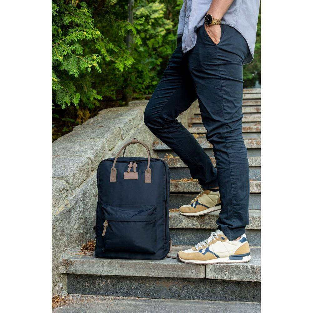 Plecak na laptopa 15,6" B'RIGHT, wykonany z RPET, zgodny z certyfikatem GRS (Global RecycIed Standard), 2 przegrody główne na zamek błyskawiczny, przednia przegroda główna z różnymi kieszonkami w środku w tym 1 boczną, tylna przegroda główna z kieszenią na laptopa, wnętrze przegród głównych wykończone podszewką w kolorze uchwytów, 1 kieszeń przednia na zamek błyskawiczny, 2 uchwyty z możliwością złączenia paskiem na napę, miękki tył i regulowane paski na ramię